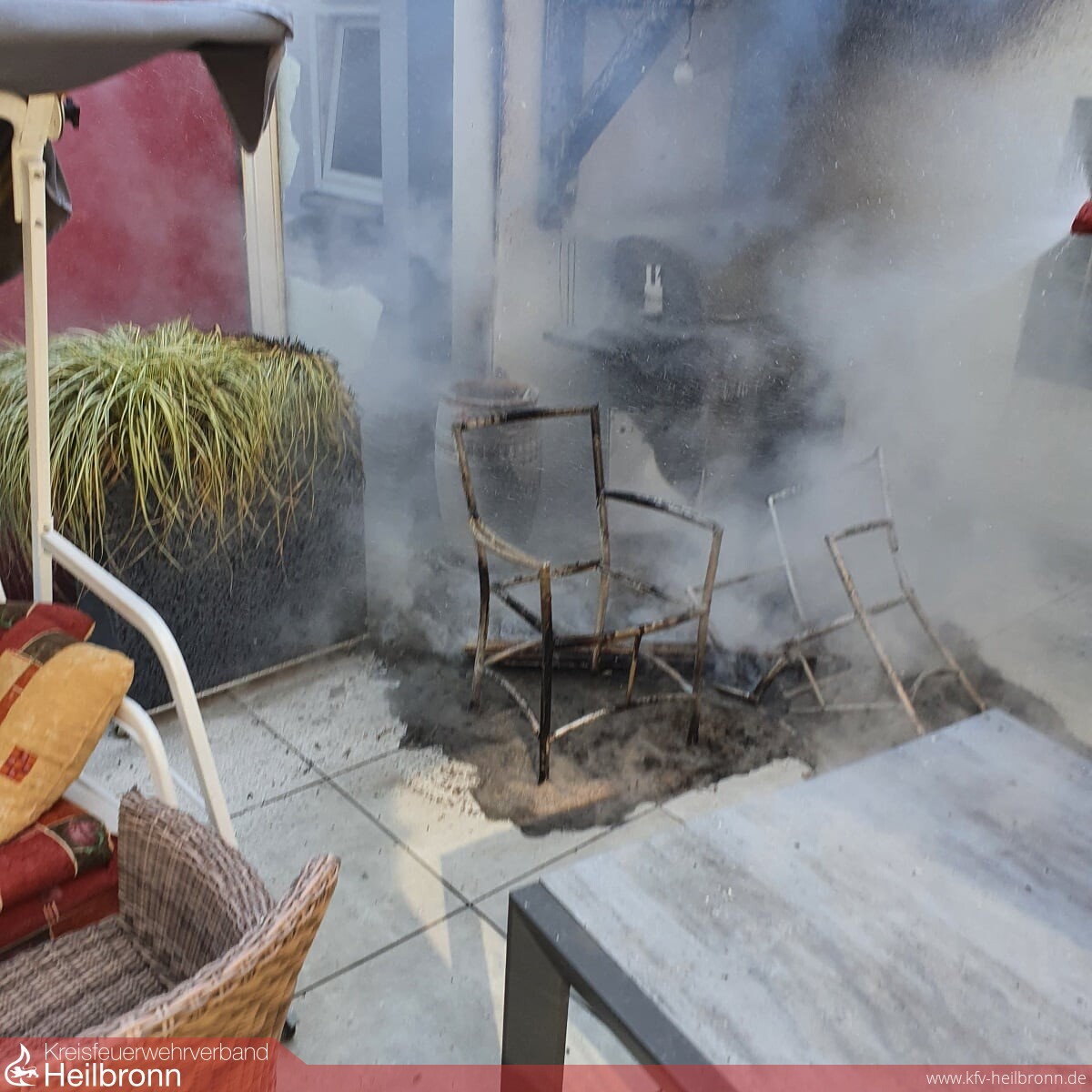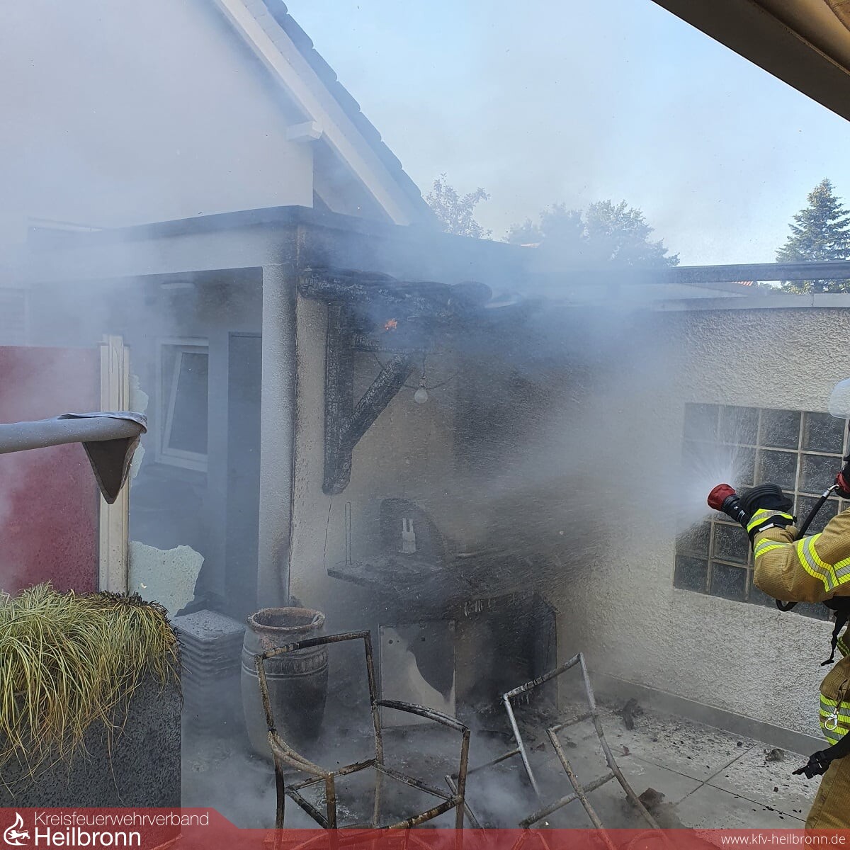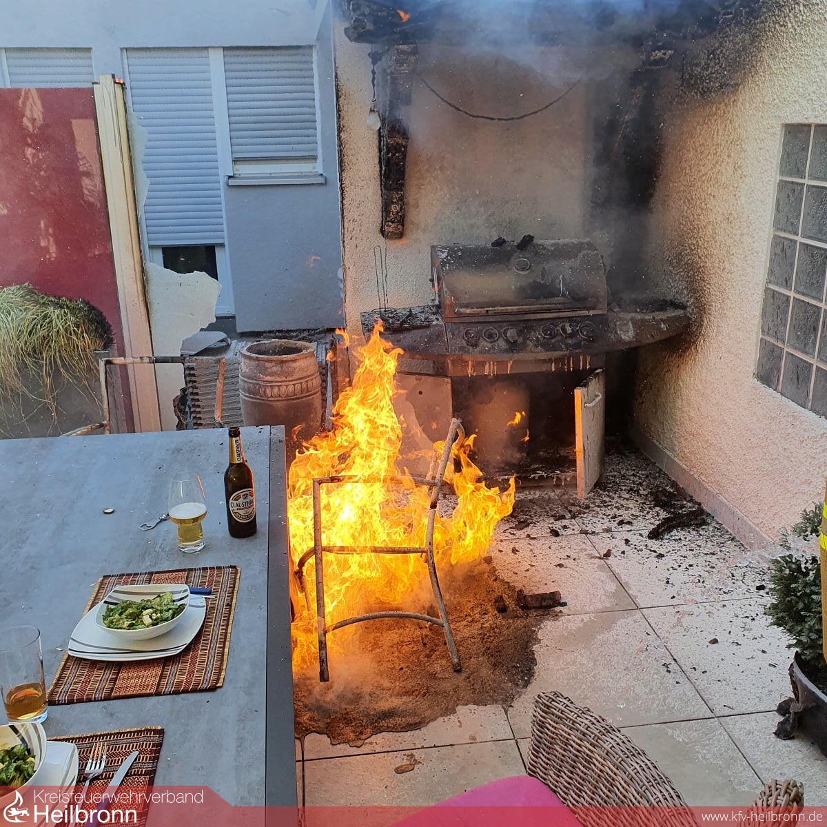 An der Einsatzstelle eingetroffen konnte durch den Einsatzleiter festgestellt werden, dass durch das Feuer bereits zwei Terassenstühle geschmolzen waren und sich der brennende Kunststoff auf den Terrassenfliesen verteilt hat. Weiter stand das Dach über dem Grill ebenfalls in Flammen. Durch einen Trupp unter Atemschutz konnte der Brand mit dem Schnellangriff recht zügig abgelöscht werden. Die Gasflasche wurde gekühlt und aus dem Gefahrenbereich verbracht. Da das Dach über dem Grill an die Garage angrenzte und auch unter der Blechverkleidung der Rauch herausgetreten ist, wurde diese vom Garagendach aus demontiert. Nach der Blechdemontage waren hier am Unterbaubalken verschiedne Glutstellen erkennbar, welche ebenfalls abgelöscht worden sind. Nach den Löscharbeiten erfolgte noch eine abschließende Kontrolle mit der Wärmebildkamera und die Übergabe der Einsatzstelle an die Polizei und die Eigentümer.