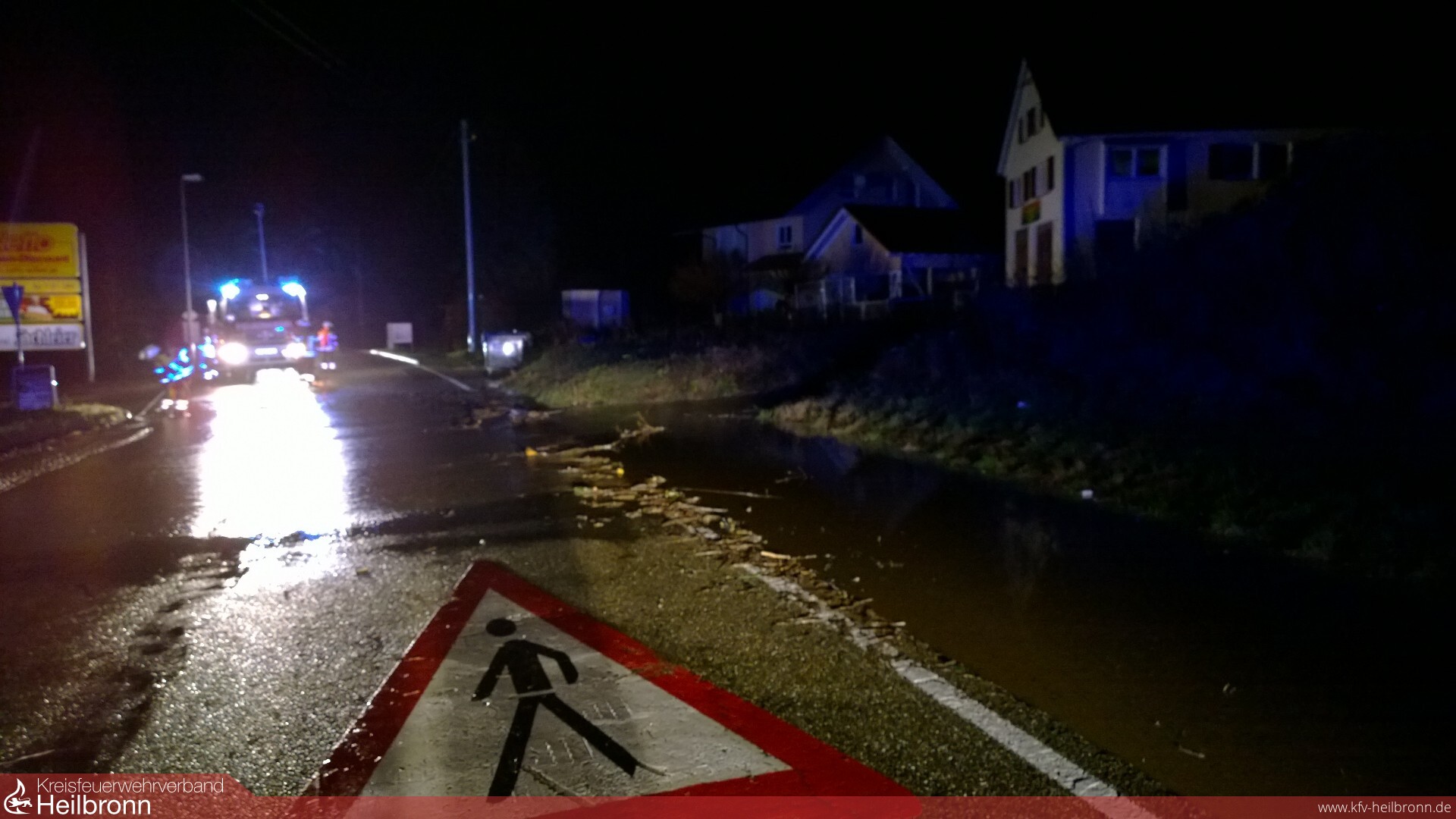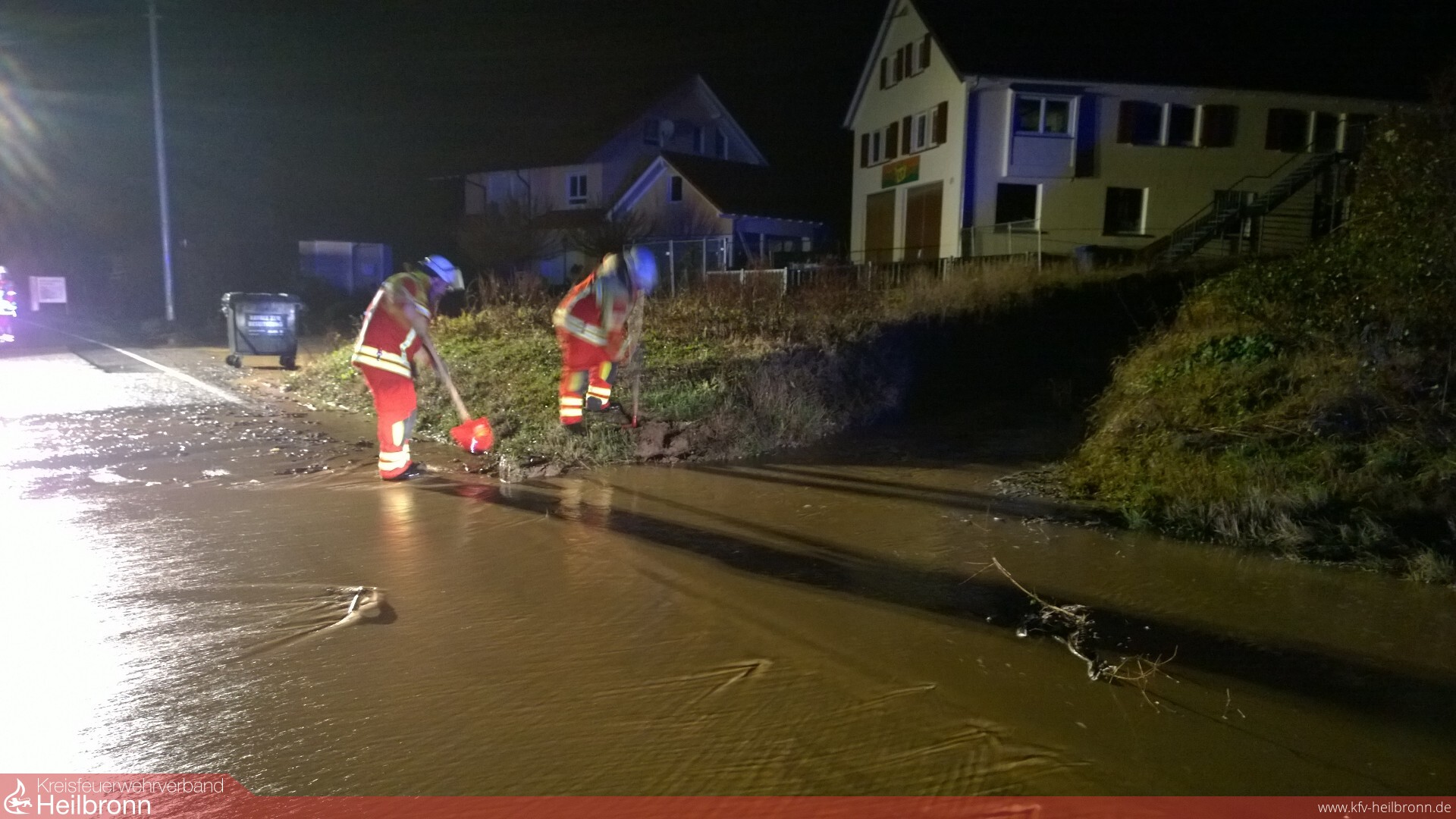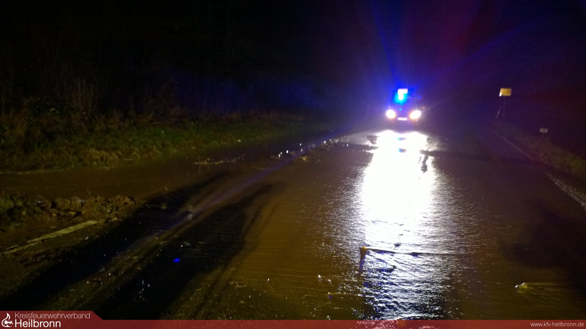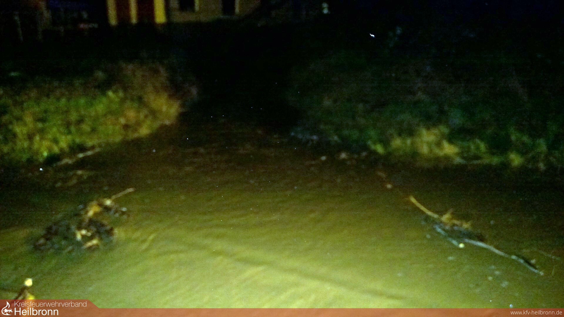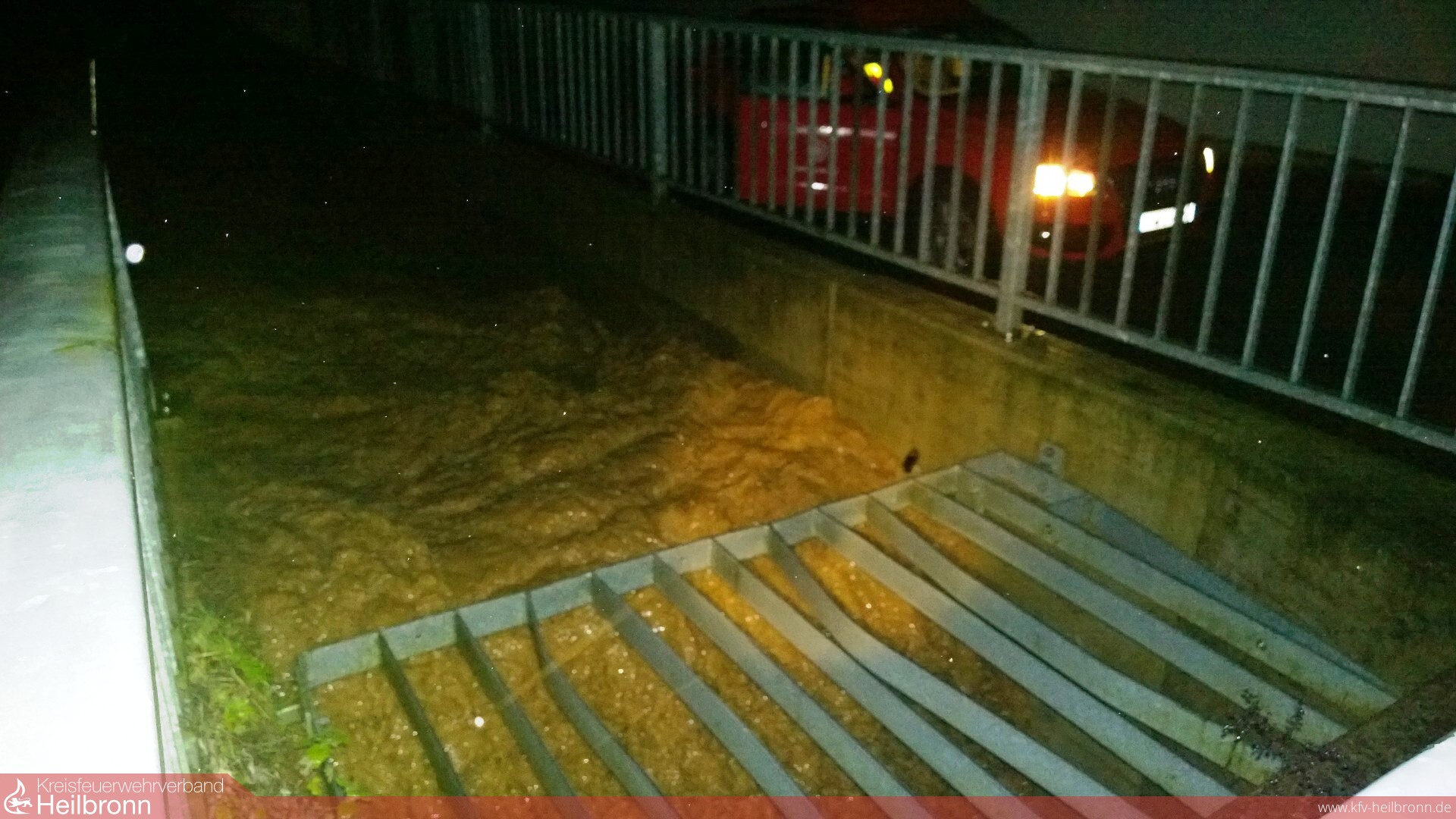 Weil nach den heftigen Regenfällen der vergangenen Stunden drohte, dass Wasser in einen Einkaufsmarkt läuft, alarmierte der zuvor privat verständigte Feuerwehrkommandant die Einsatzabteilung (EA) Neudenau. Nach Eintreffen der Einsatzkräfte konnte dass Wasser, welches über die Straße lief, durch eigens erichtete Dämme umgeleitet und somit die Gefahr für den Einkaufmarkt, beseitigt werden. Durch den Bauhof wurde der Wasserlauf dann noch mittels Frontlader optimiert und die Landesstraße vom groben Schmutz gesäubert. Die hinzugerufene Straßenmeisterei sicherte die Gefahrenstelle mit Schildern und Blitzleuchten ab. Ein unbelehrbarer Autofahrer durchfuhr die Sperrung der Feuerwehr und gefährdete dadurch einen Kameraden. Die Polizei wurde entsprechend verständigt.
