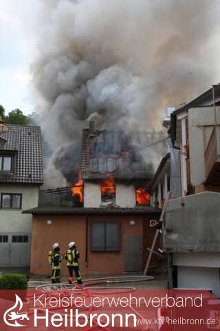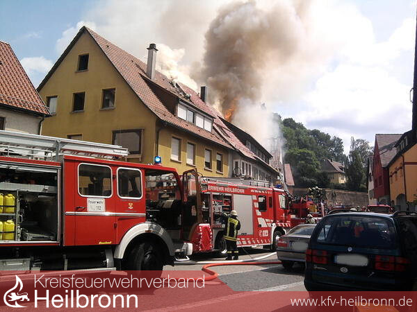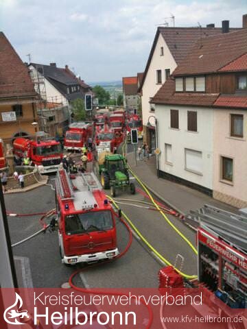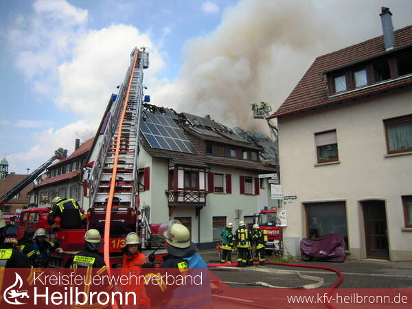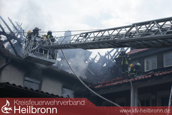 Drei Drehleitern, aus Weinsberg, Obersulm und Wüstenrot, ermöglichen Löschangriffe von oben. Gegen 14 Uhr zeigt sich aber, dass die Flammen nicht aufzuhalten sind. Entlang der Ortsdurchfahrt erfassen sie die Dachstühle von drei weiteren Häusern. Eine wichtige Aufgaben kommt den vielen Atemschutz-Trupps zu, die in den Häusern ansetzen.