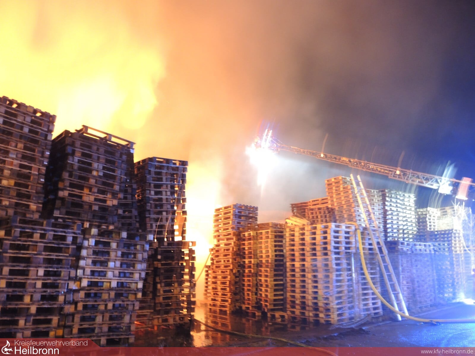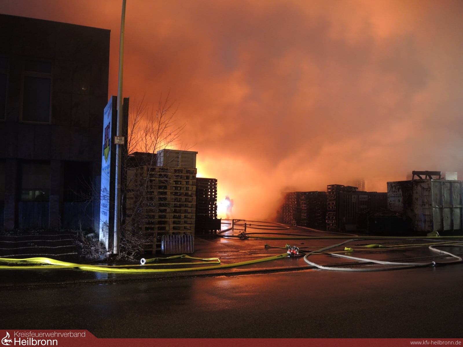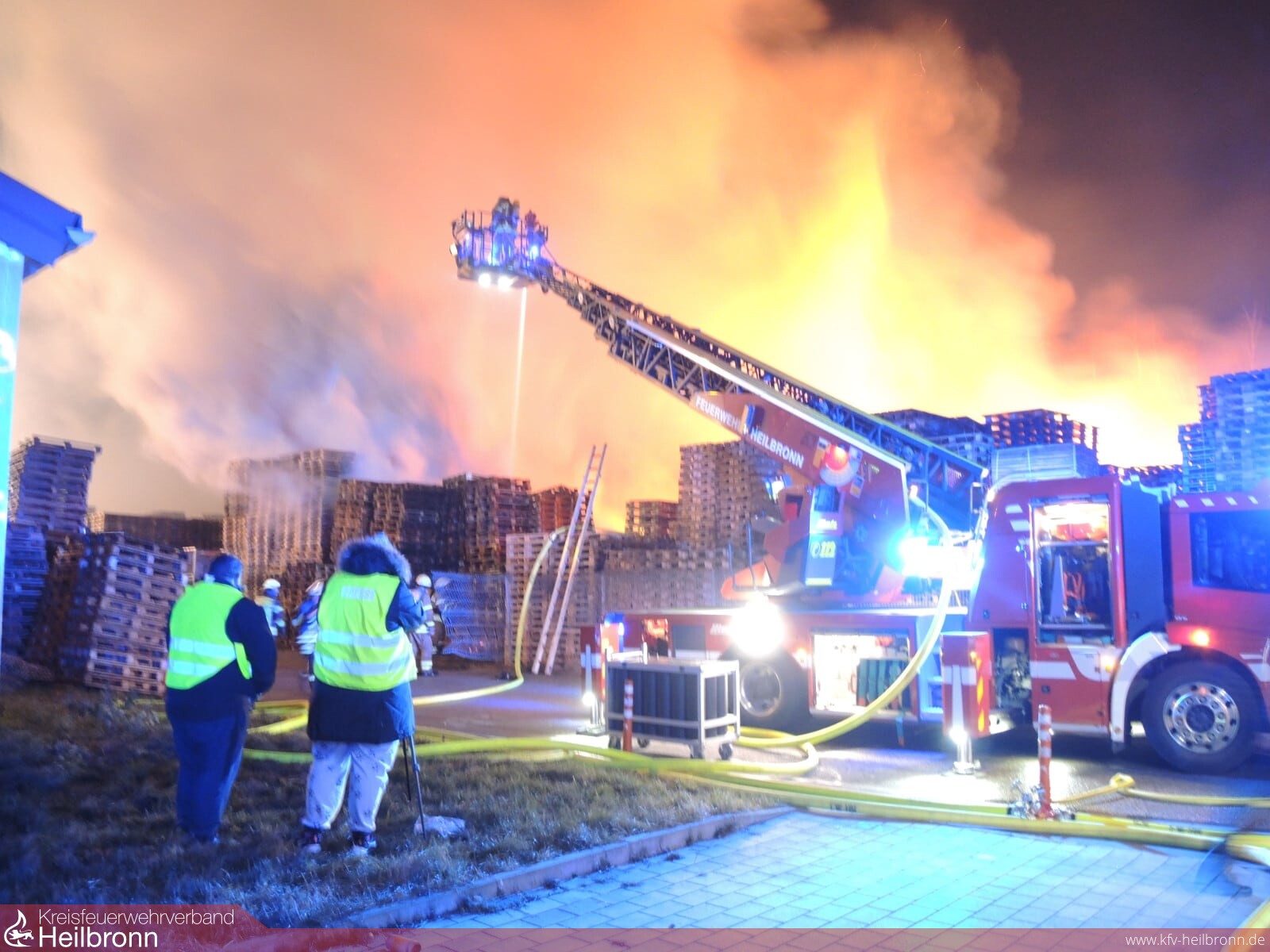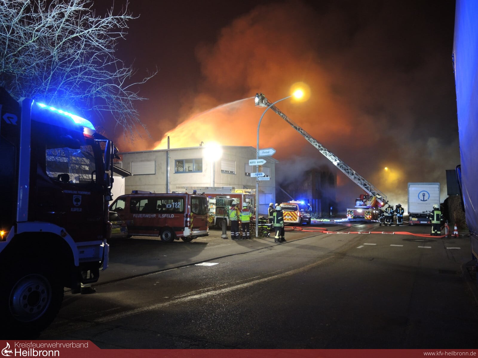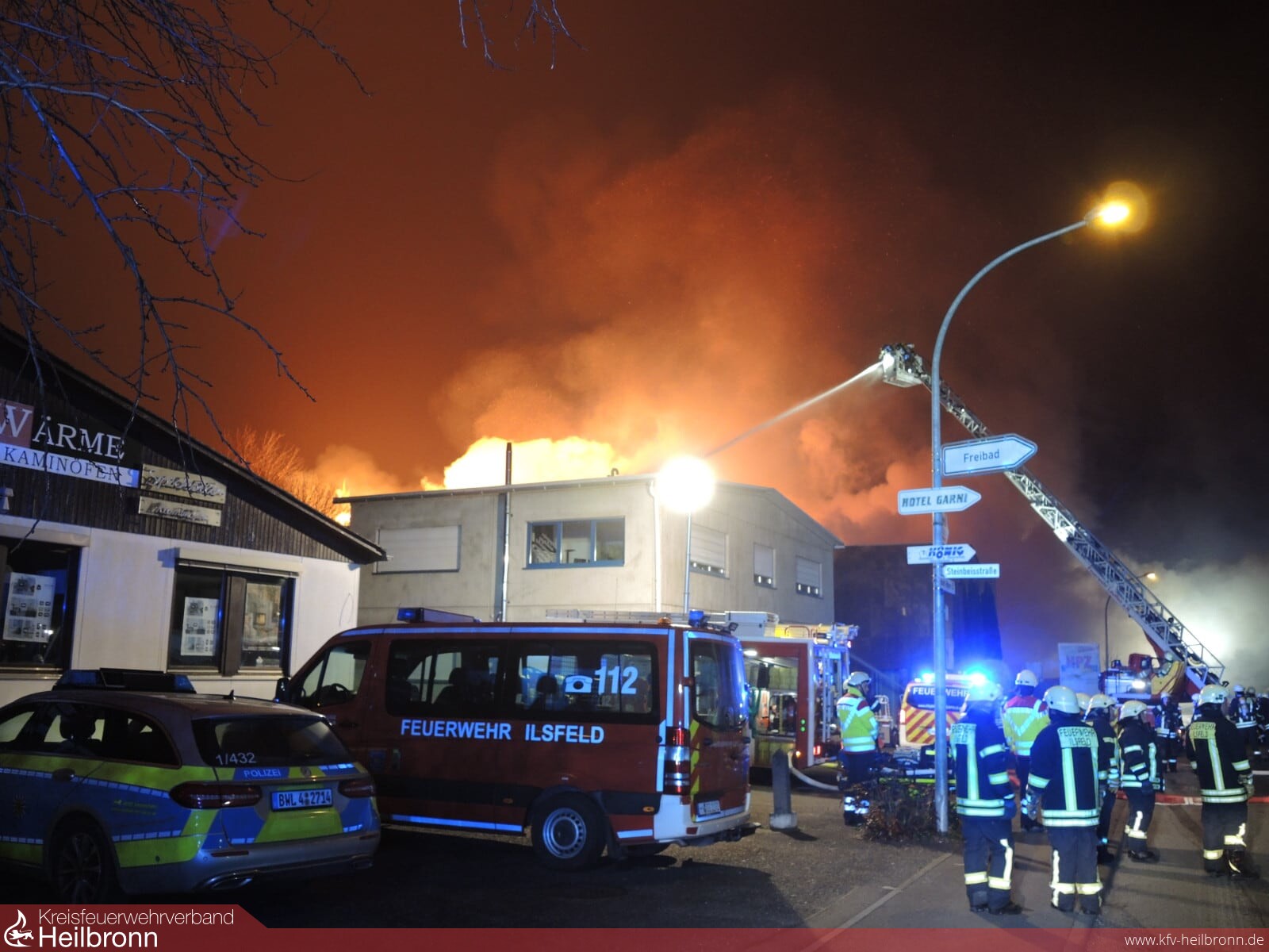 Die Feuerwehr Ilsfeld wurde gegen 21 Uhr mit dem Alarmstichwort „Gebäudebrand“ in die Mercedesstraße alarmiert. Bereits auf der Anfahrt der Feuerwehrkräfte zum Feuerwehrhaus war sofort ein riesiger Feuerschein sichtbar. Deshalb wurde die Alarmierung durch den Kommandanten und seinen Stellvertreter sofort auf „Gefahrenabwehrstufe 3 Brand Industriegebäude“ erhöht sowie weitere Kräfte nachgefordert. Beim Eintreffen der Feuerwehr stand bereits die komplette Halle der Firma, welche Holzpaletten herstellt, in Flammen.