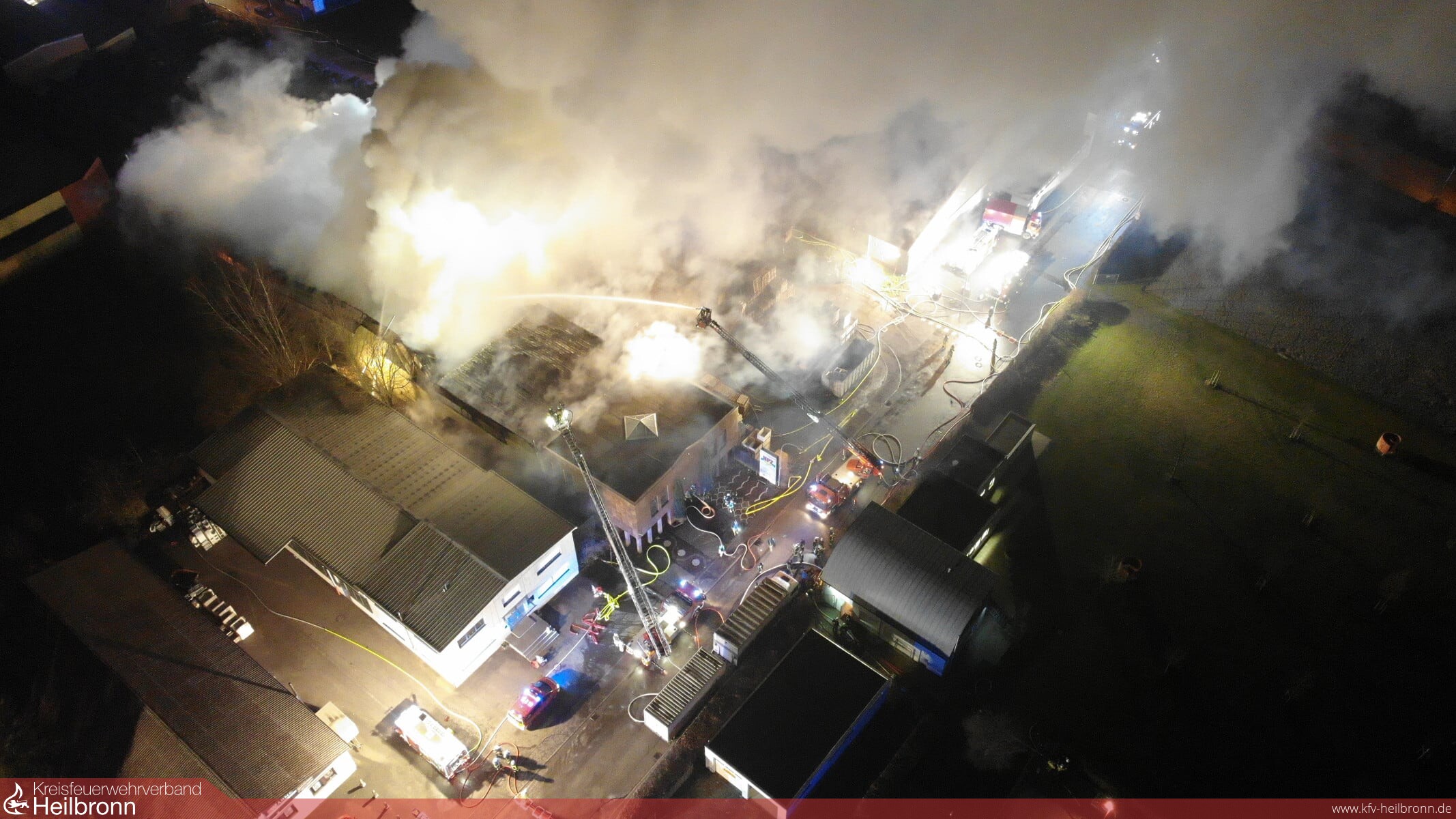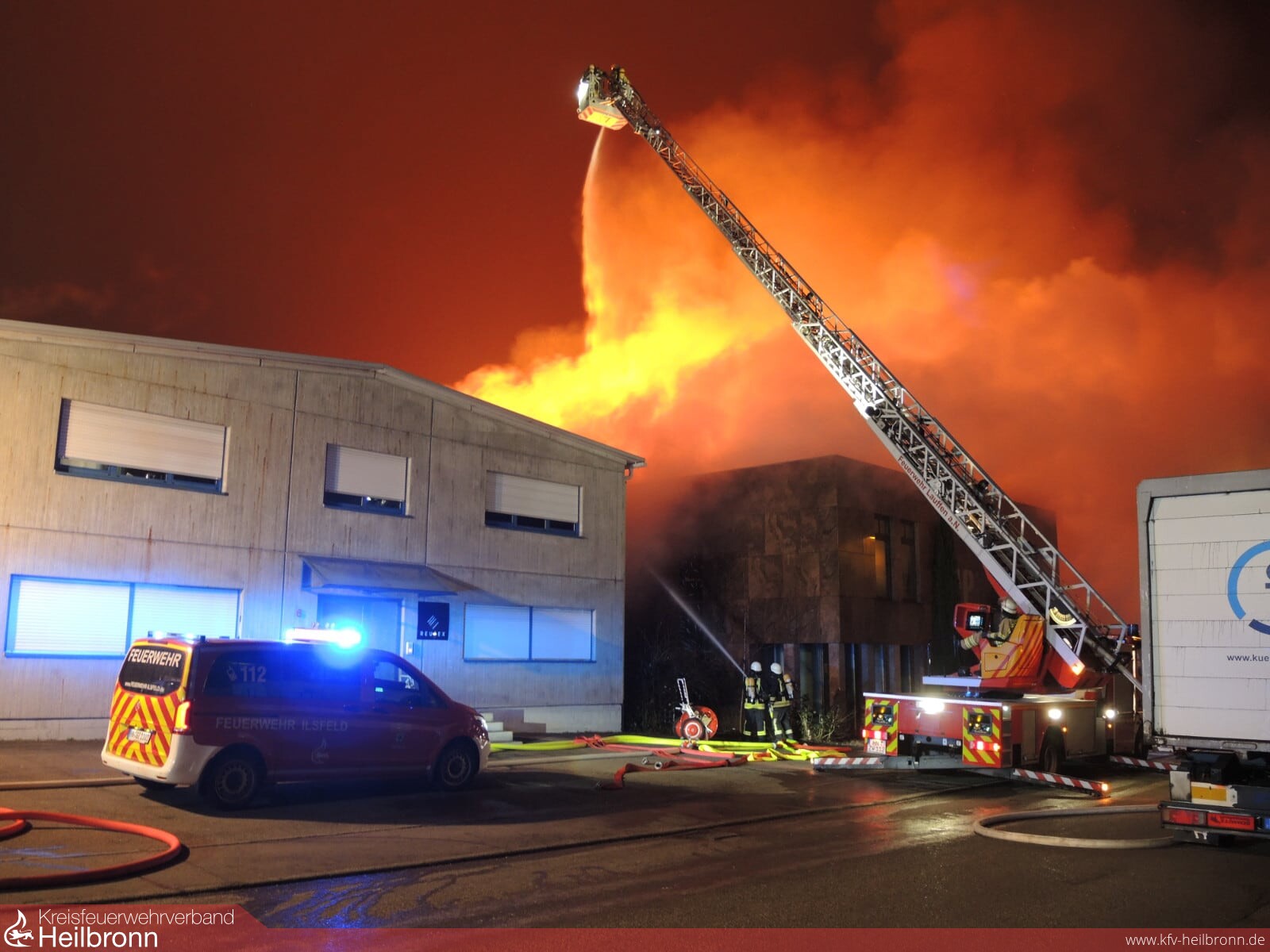 Deshalb war schnell klar dass die Priorität auf den Schutz der Nachbargebäude (Firmengebäude und Tennishalle) gesetzt werden muss. Hierzu wurden mehrere Riegelstellungen vorgenommen und die benachbarten Gebäude mit Wasser gekühlt. Der Brand der Produktionshalle konnte nur von oben gelöscht werden, da ein Innenangriff bei dieser Brandausbreitung unmöglich war. Die Drehleitern der Feuerwehren Lauffen, Weinsberg und Heilbronn sowie zahlreiche Atemschutzgeräteträger kamen zum Einsatz. Aufgrund des massiven Einsatzes von Atemschutzträgern, wurde das Sonderfahrzeug AB Atemschutz der Berufsfeuerwehr Heilbronn angefordert.