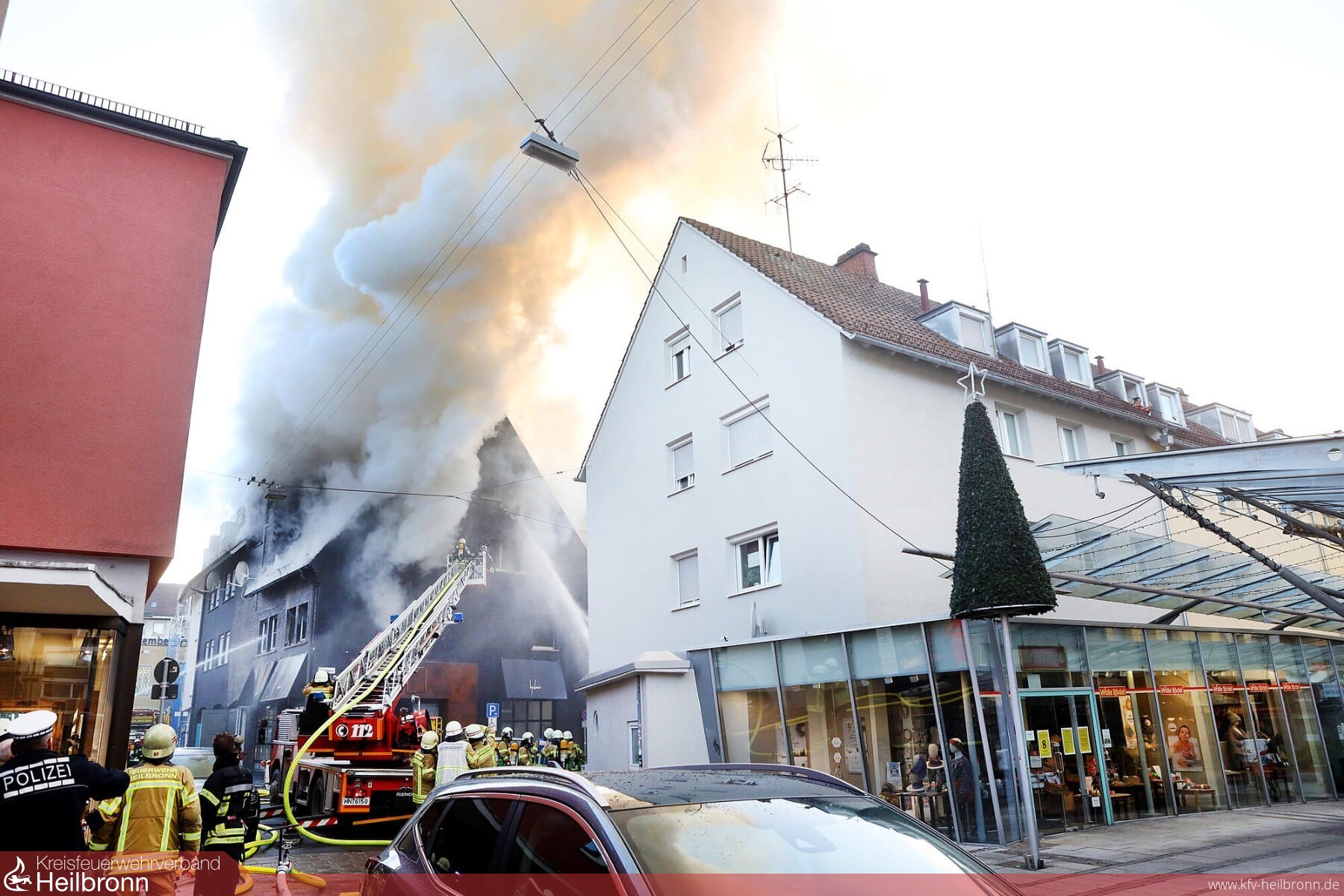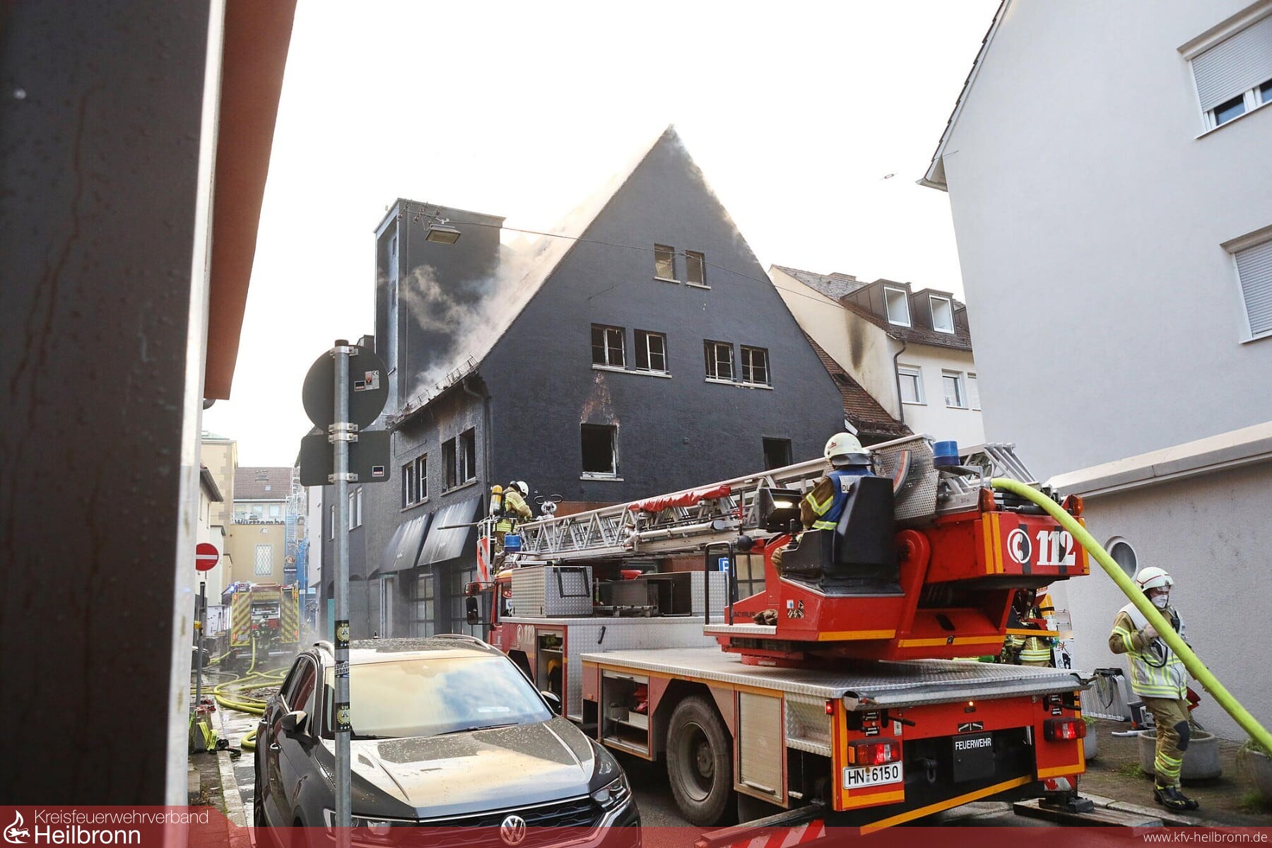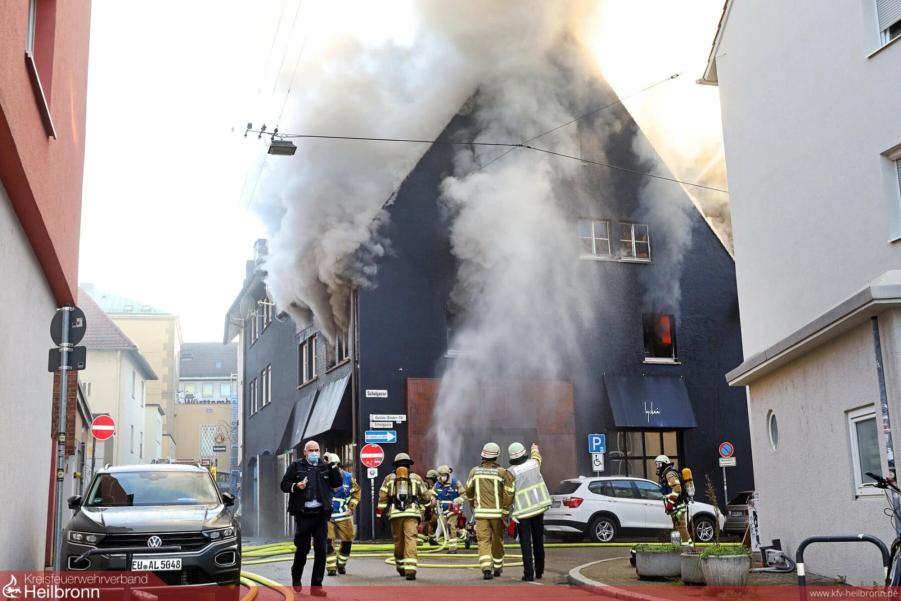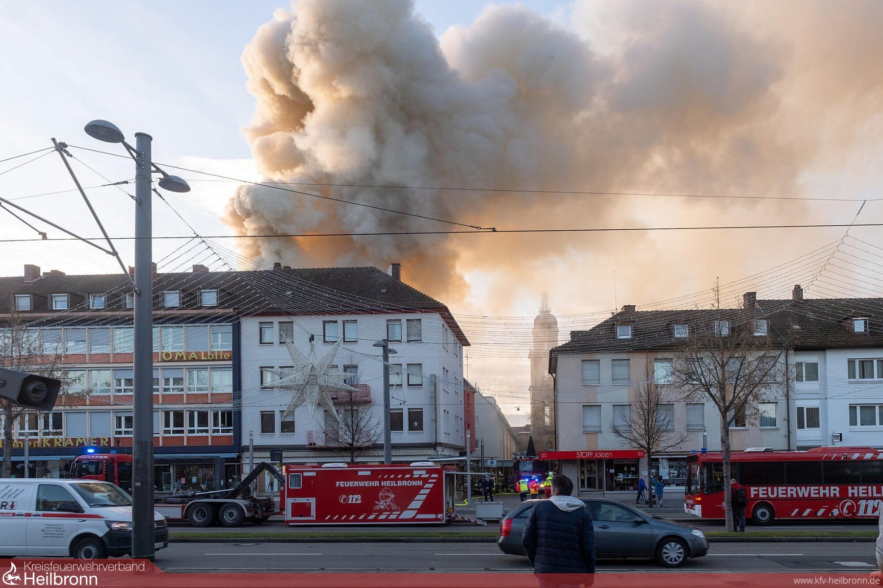 Die Flammen breiteten sich rasant auf das darüber liegende Geschoss des leerstehenden Gebäudes aus. Beim Eintreffen der Feuerwehr an der Einsatzstelle stand das erste Obergeschoss bereits im Vollbrand. Die innerstädtische Wohnbebauung mit engen Gassen und parkenden Fahrzeugen erschwerten es das Brandobjekt mit massiven Einsatzkräften zu erreichen. Dennoch gelang es den insgesamt 122 Kräften der Berufs- und Freiwilligen Feuerwehr mit 22 Fahrzeugen die Flammen nach rund einer Stunde unter Kontrolle zu bringen. Die angrenzenden Nachbargebäude wurden gleich zu Beginn geräumt und blieben nach ersten Erkenntnissenn von den Flammen verschont. Auch für das betroffene Gebäude selbst bestand keine Einsturzgefahr. Heilbronns Oberbürgermeister Harry Mergel war ebenfalls frühzeitig am Einsatzort, um sich selbst über das Schadensausmaß zu informieren.