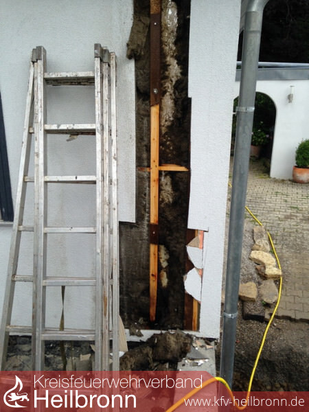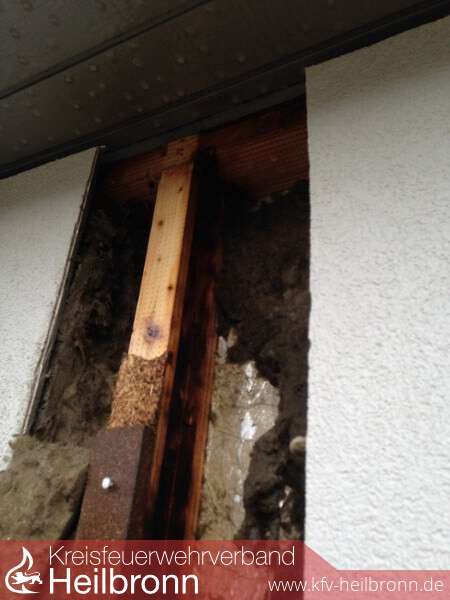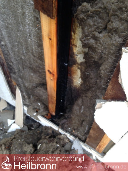 Die Feuerwehr öffnete die Wand über die gesamte Geschosshöhe und löschte dabei mehrere Glutnester ab. Weiterhin wurde die Temperatur mittels Wärmebildkamera kontrolliert.