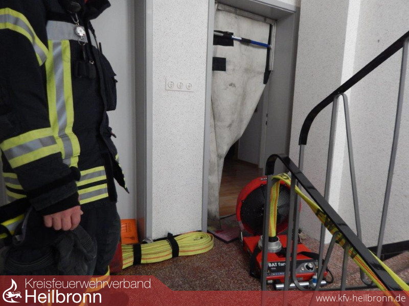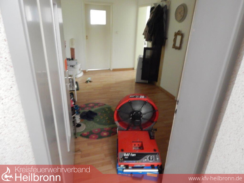 Da bereits im Treppenraum Rauchgeruch festzustellen war, wurde die Wohnungseingangstür mit Spezialwerkzeug geöffnet.