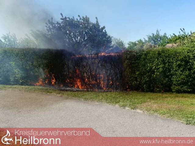 Breits auf der Anfahrt war eine Rauchentwicklung sichtbar. Beim Eintreffen der Feuerwehr brannte eine Hecke auf ca. 5 Meter Länge sowie eine im Hintergrund stehende Pergola in voller Ausdehnung.