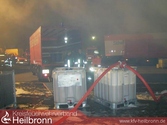 Gegen 22:00 Uhr bat die Feuerwehrleitstelle des Rhein-Neckar-Kreises um Unterstützung mit Schaummittel bei der Feuerwehr Heilbronn. Mit zwei Lastwagen transportierten die Heilbronner Kollegen rund 5 000 Liter Schaummittel nach Reilingen. Dort verteilten sie das Schaummittel an die eingesetzten Feuerwehren des Rhein-Neckar-Kreises.