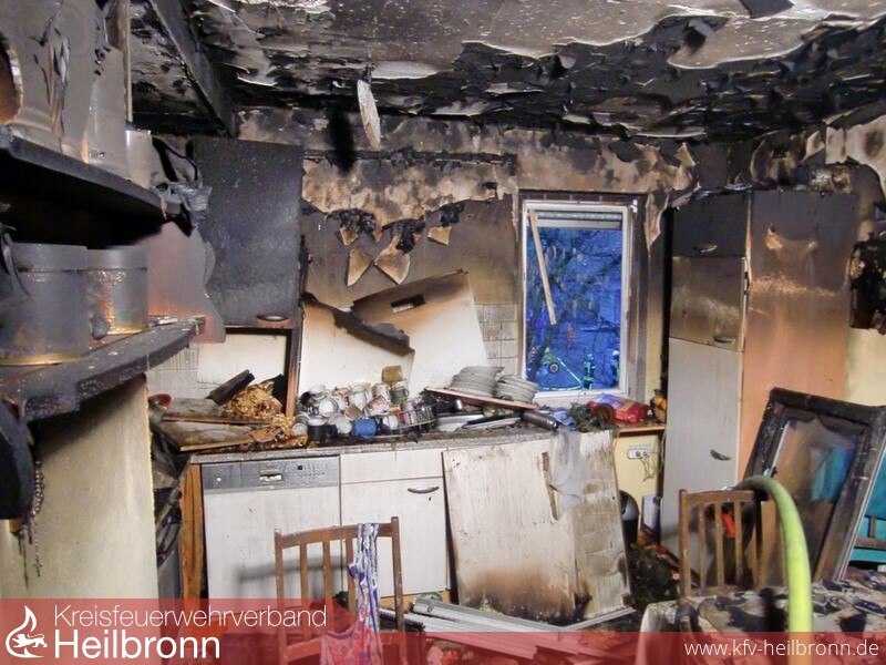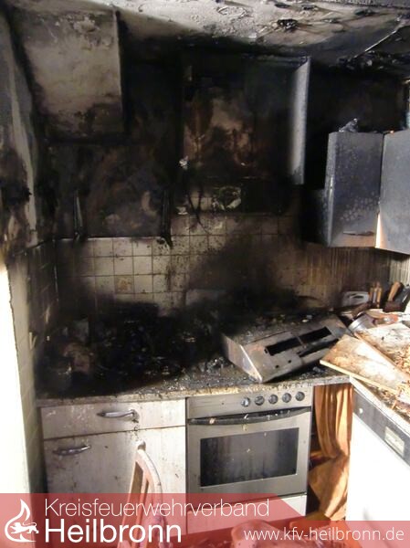 Hier war es zu einem ausgedehnten Küchenbrand gekommen, nachdem sich heißes Fett in einem Topf auf dem Herd entzündet hatte.