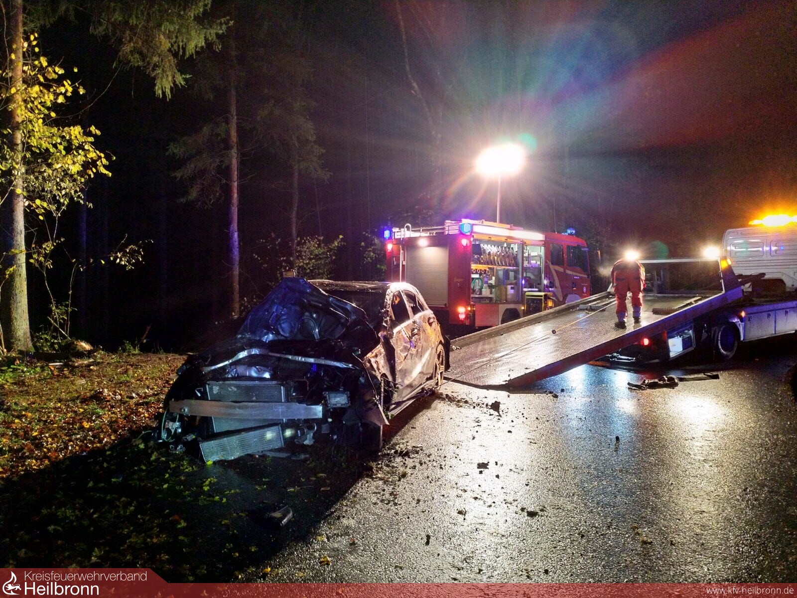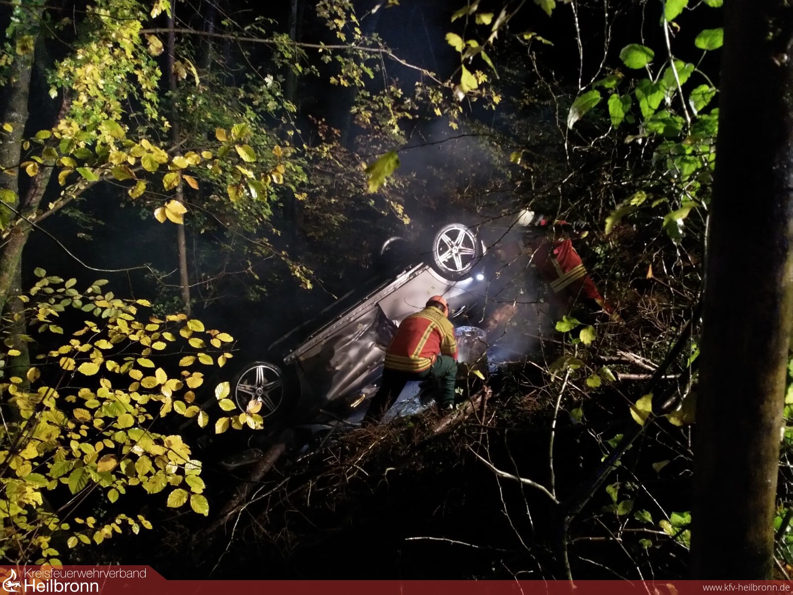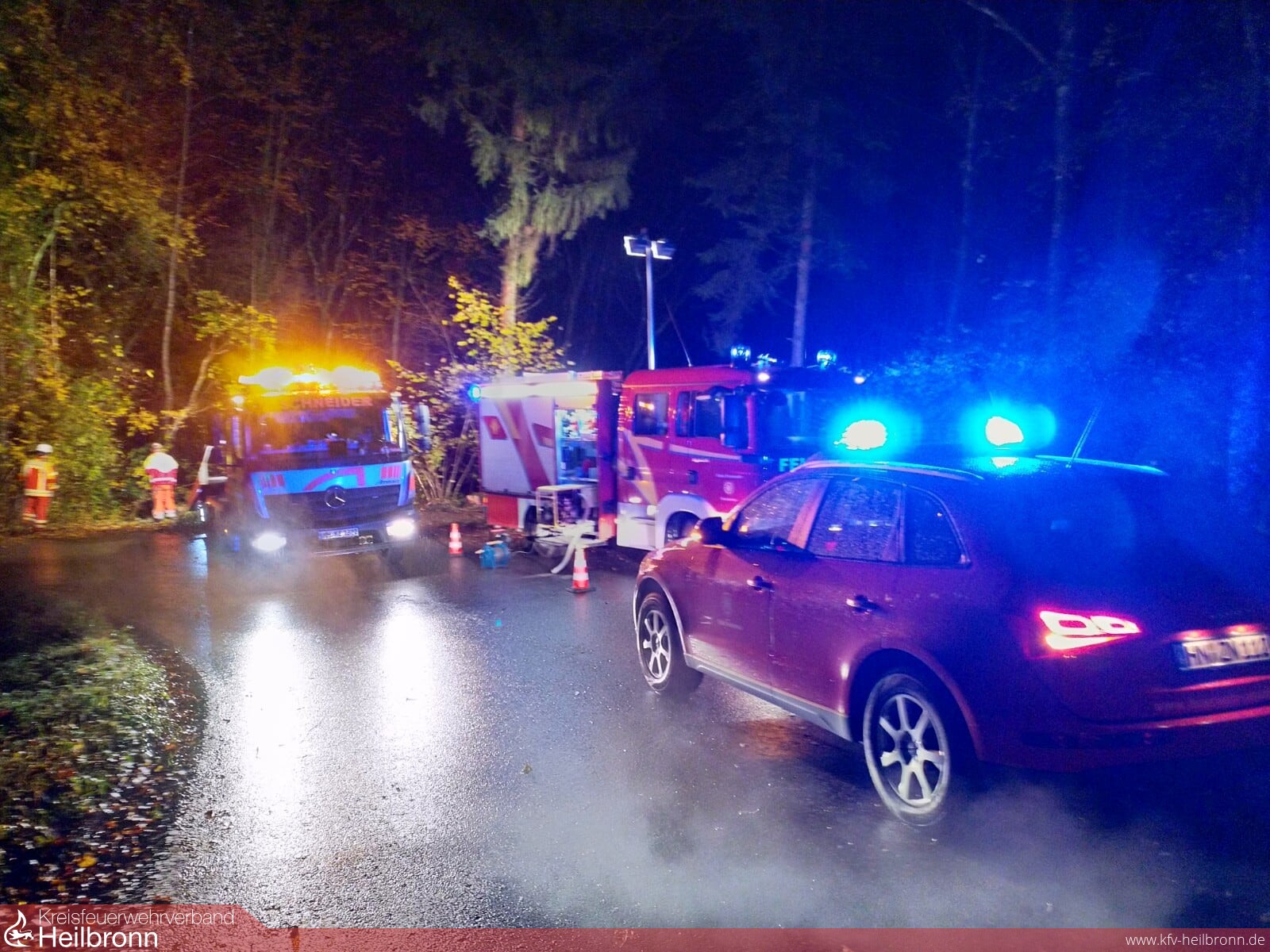 Nachdem bereits um 22:37 Uhr die Helfer-vor-Ort-Gruppe zu einem Unfall zwischen Neudenau und Reichertshausen alarmiert wurde, erfolgte um 22:54 Uhr ein Alarm für die Feuerwehr wegen auslaufendem Kraftstoff. Alarmiert wurden die Einsatzabteilungen Siglingen und Neudenau.