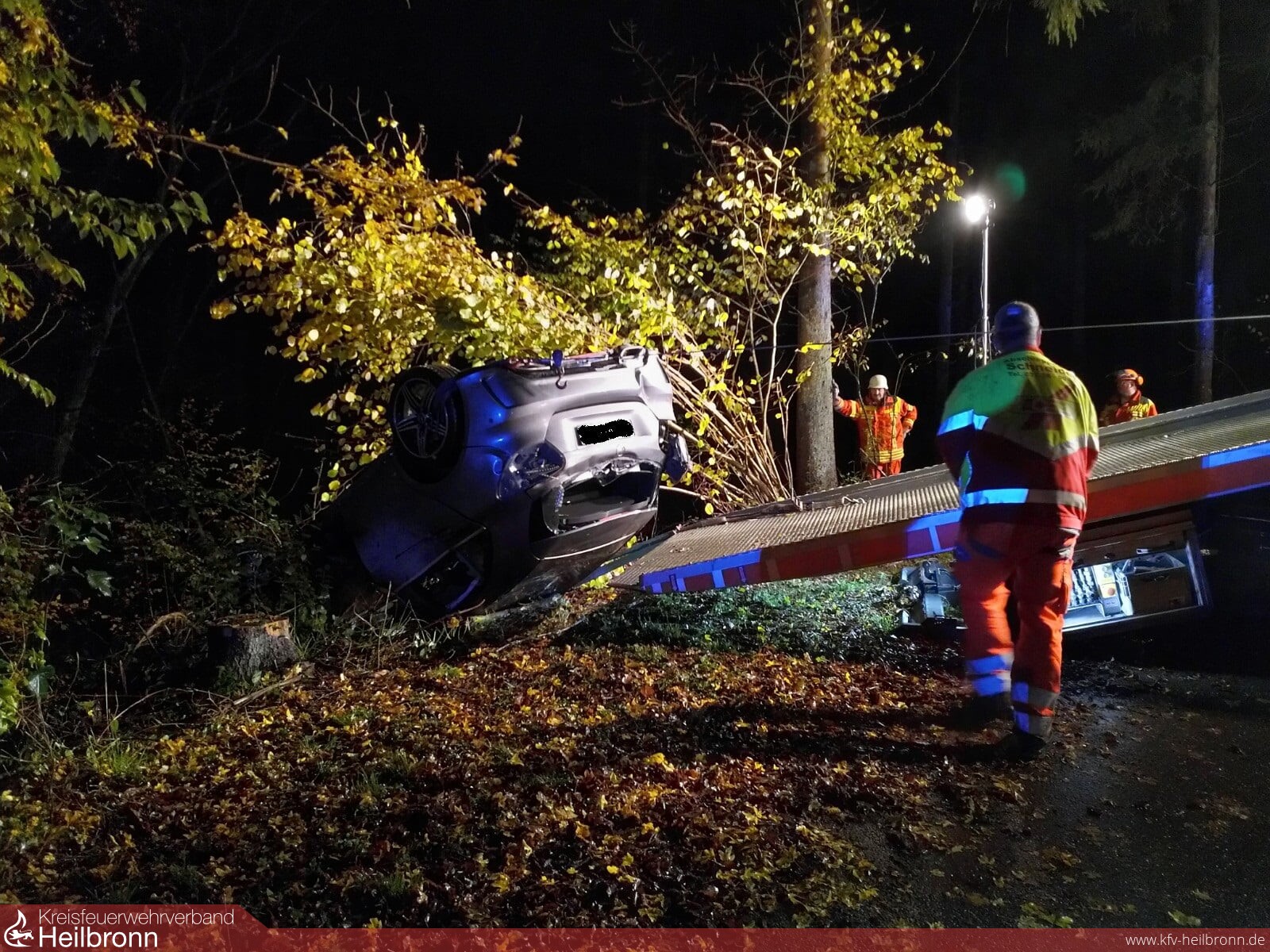 Die Feuerwehr stellte standardmäßig den Brandschutz sicher und leuchtete die Unfallstelle aus. Die anschließende Bergung des Pkw, durch ein Abschleppunternehmen, gestaltete sich äußerst schwierig, so dass die Feuerwehr immer wieder unterstützte, Dabei kam beispielsweise eine Kettensäge zum Einsatz.
