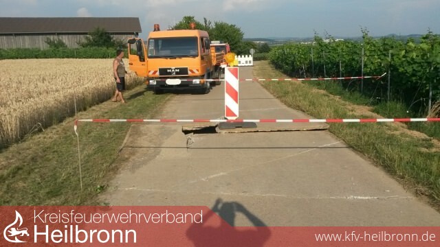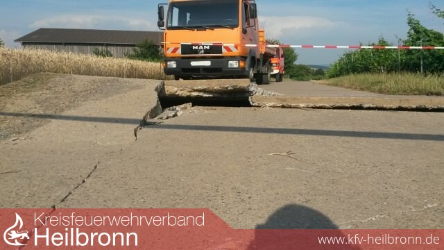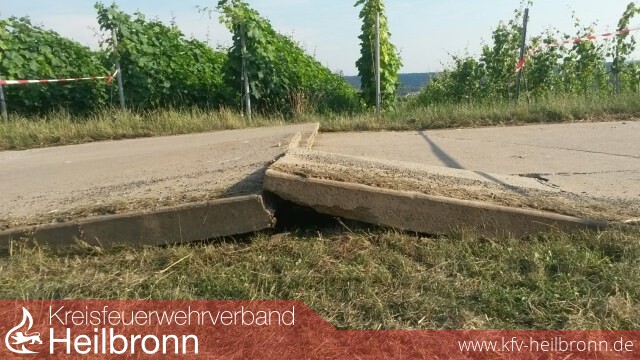 Offensichtlich ist es auf die momentane Hitzeeinwirkung zurückzuführen, dass sich Betonbodenplatten auf einem Feldweg ausgedehnt und aufgetürmt haben, so dass ein Fahrzeug bei der Überfahrt beschädigt wurde.