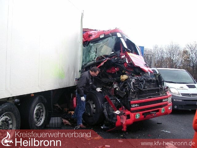 Aufgrund der Verkehrslage kam es auf dem rechten Fahrstreifen zu einem Stau. Ein 30jähriger Lkw-Fahrer der sich mit seinem Sattelzugschlepper dem Stau näherte, erkannte dies zu spät. Mit großer Wucht fuhr er in das Heck seines Vordermanns. Durch den Aufprall wurde dieser auf das vor ihm stehenden Fahrzeug aufgeschoben. Durch die hierbei entstehende Kettenreaktion wurde auch noch ein viertes Sattelzugfahrzeug touchiert. Bei diesem entstand jedoch nur ein leichter Sachschaden.
