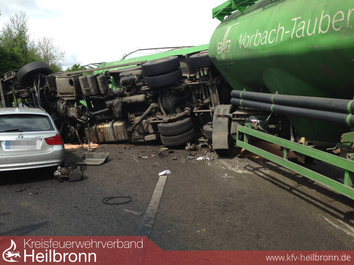 Zu einem weiteren schweren Verkehrsunfall auf der A 6 in Fahrtrichtung Mannheim, kam es in der Nacht kurz vor 2.00 Uhr. Mehrere Lastwagen stießen auf Höhe Weinsberg-Wimmental zusammen. Durch die enorme Wucht des auffahrenden Fahrzeuges, wurde ein Anhänger in die Lärmschutzwand gedrückt. Zwei Fahrer, ein 57-Jähriger sowie ein 45-Jähriger, wurden hierbei schwer verletzt aus ihren Wracks befreit.
