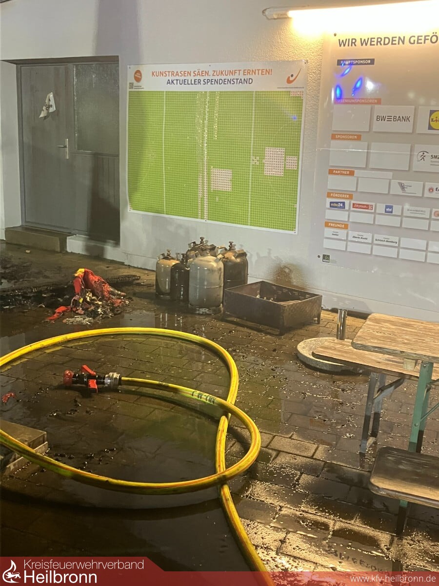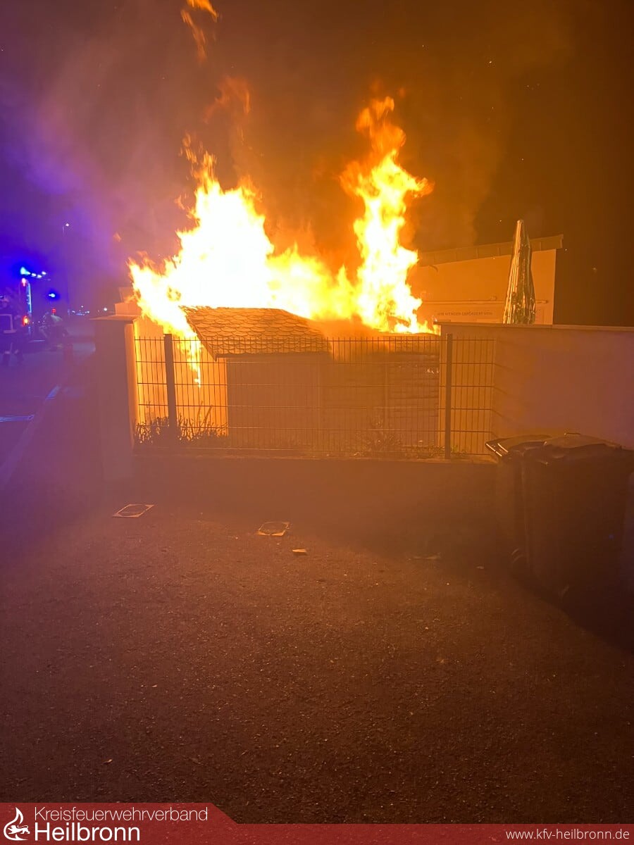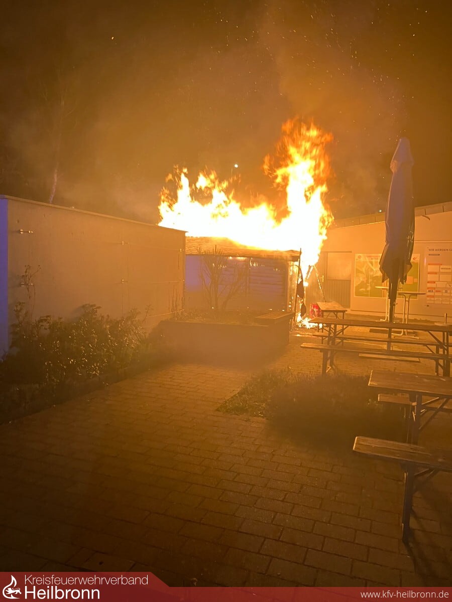 Am heutigen Sonntag wurde die Feuerwehr kurz nach 22 Uhr in die Schlizstraße alarmiert. Anwohner hatten Flammen an einem Holzgebäude in unmittelbarer Nähe eines Vereinsheimes bemerkt und den Notruf gewählt. Beim Eintreffen der Einsatzkräfte vor Ort, stand eine kleine Hütte in Vollbrand. Das Feuer drohte bereits über eine geborstene Scheibe auf das Nachbargebäude überzugreifen. Ein Anwohner war dabei mit einem Gartenschlauch erste Löschmaßnahmen durchzuführen. Mehrere Gasflaschen strömten brennend ab und fachten das Feuer zusätzlich an. Die Einsatzkräfte hatten den Brand dennoch schnell unter Kontrolle und konnten somit eine Brandausbreitung sicher verhindern.