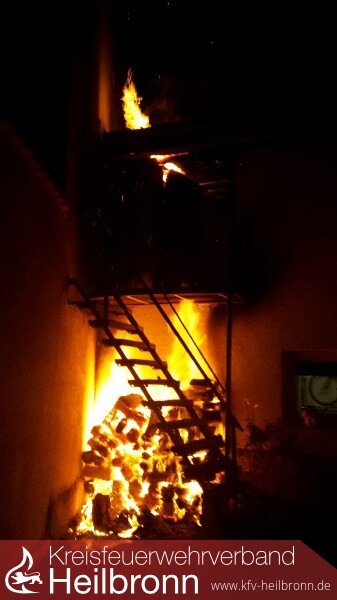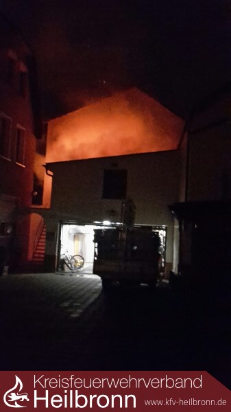 Um 5:37 Uhr wurde die Feuerwehr Bad Friedrichshall mit dem Stichwort „Wohnungsbrand“ in das Unterdorf im Stadtteil Jagstfeld alarmiert. Beim Eintreffen des Kommandanten, welcher in direkter Nachbarschaft wohnt, brannte ein Holzstapel welcher an der Garagenaußenwand gelagert war in voller Ausdehnung und war bereits auf das komplette Gebäude übergegriffen. Die Doppelgarage welche mit einem Lagerplatz aufgestockt ist, war komplett Verraucht. Kritisch gestalteten sich die Löscharbeiten aufgrund der engen Bebauung und die direkte Verbindung der Garage zu den Nachbargebäuden. Ein Zimmer des Nachbarhauses sowie eine angrenzende Garage waren durch den Brand bereits vom Rauch beaufschlagt und mussten durch Trupps unter Atemschutz mit Belüftungsgeräten rauchfrei gemacht und kontrolliert werden. Der Brand konnte rasch von 2 Trupps unter Atemschutz mit 2 C-Rohren sowie dem Wenderohr über die Drehleiter gelöscht werden. Von der Feuerwehr wurde das Dachgeschoss der Garage ausgeräumt und Glutnester abgelöscht. Ebenso wurde die aus Eternitwellplatten bestehende Dacheindeckung entfernt. Mit der Wärmebildkamera wurde die Fassaden der direkt angrenzenden Gebäude kontrolliert. Glücklicherweise wurde niemand verletzt. Die Nachlösch- und Aufräumarbeiten zogen sich bis in die Vormittagsstunden hinein.