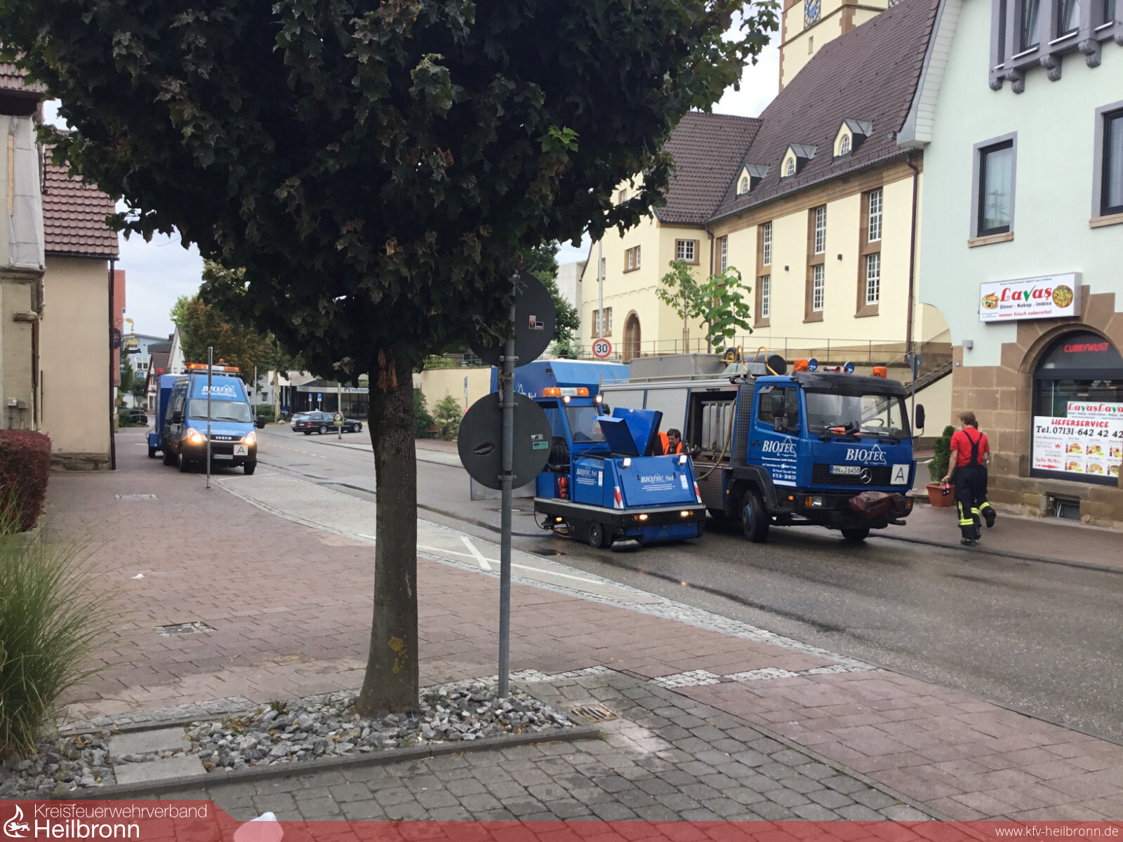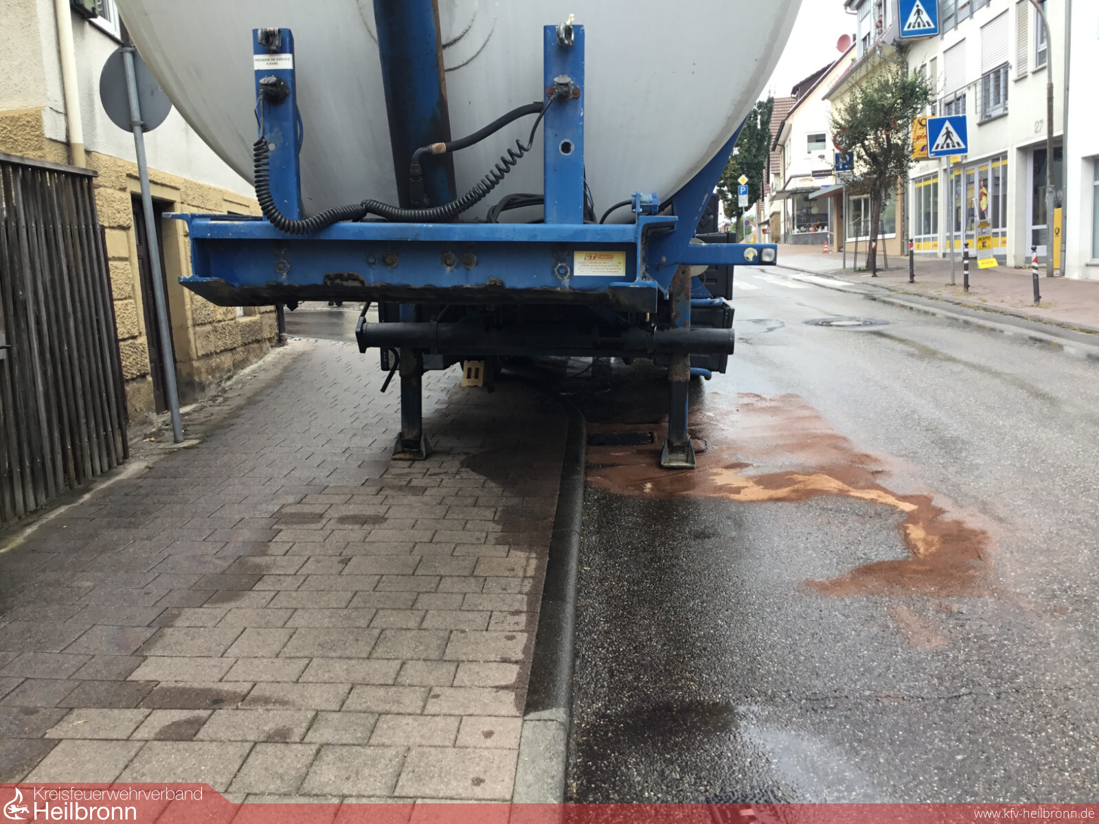 Ein LKW-Fahrer wurde am Montag, den 13.08.2018 darauf aufmerksam gemacht, dass er aus seinem Tank Hydrauliköl verlieren würde. Umgehend stoppte er sein Fahrzeug und stellte fest, dass der Hydrauliktank undicht war. Gegen 12:05 Uhr alarmierte die Leitstelle Heilbronn die Einsatzkräfte Leingartens mit dem Stichwort „Ölspur“. Die rund 150 l Öl aus dem Tank waren bereits auf der Straße verteilt. Mittlerweile wurde das Hydrauliköl durch die PKWs der viel befahrenen Heilbronner Straße weitreichend verteilt. Beim Eintreffen der Feuerwehr, sperrte diese die Straße umgehend ab. Ein Ablaufschacht am Straßenrand wurde abgedichtet und die Kläranlage verständigt. Durch das verteilte Öl war es bereits zu mehreren Stürzen von Radfahrern gekommen. Daraufhin wurden weitere Straßen gesperrt. Für die Beseitigung der Ölspur wurde eine Fachfirma beauftragt, die mit zwei thermischen Reinigungsmaschinen insgesamt 18 Straßen abfahren mussten. Während der Arbeiten mussten Abschnitte gesperrt werden. In Absprache mit der Polizei wurde dies durch die Feuerwehr erledigt. Nach rund fünf Stunden konnte der Einsatz beendet werden.