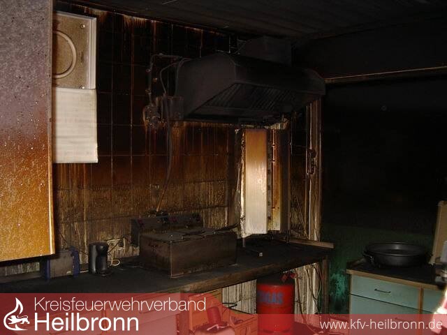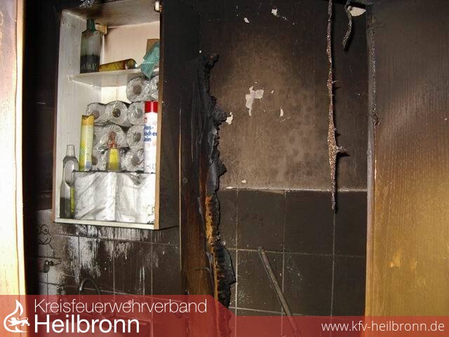 Der Brand, vermutlich ausgebrochen durch einen technischen Defekt an einem Gefrierschrank, hatte sich bereits in ein Nachbarzimmer vorgearbeitet. Die Abschlusstüre zu diesem Zimmer war bereits komplett durchgebrannt.