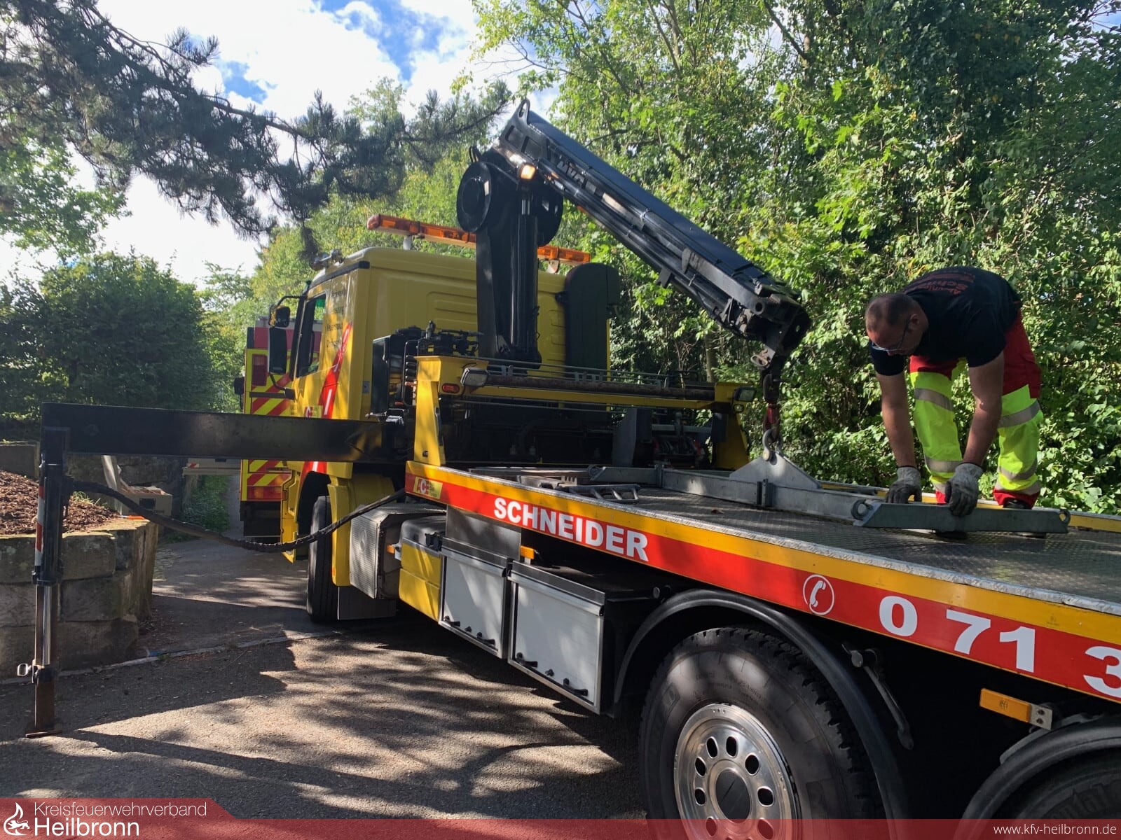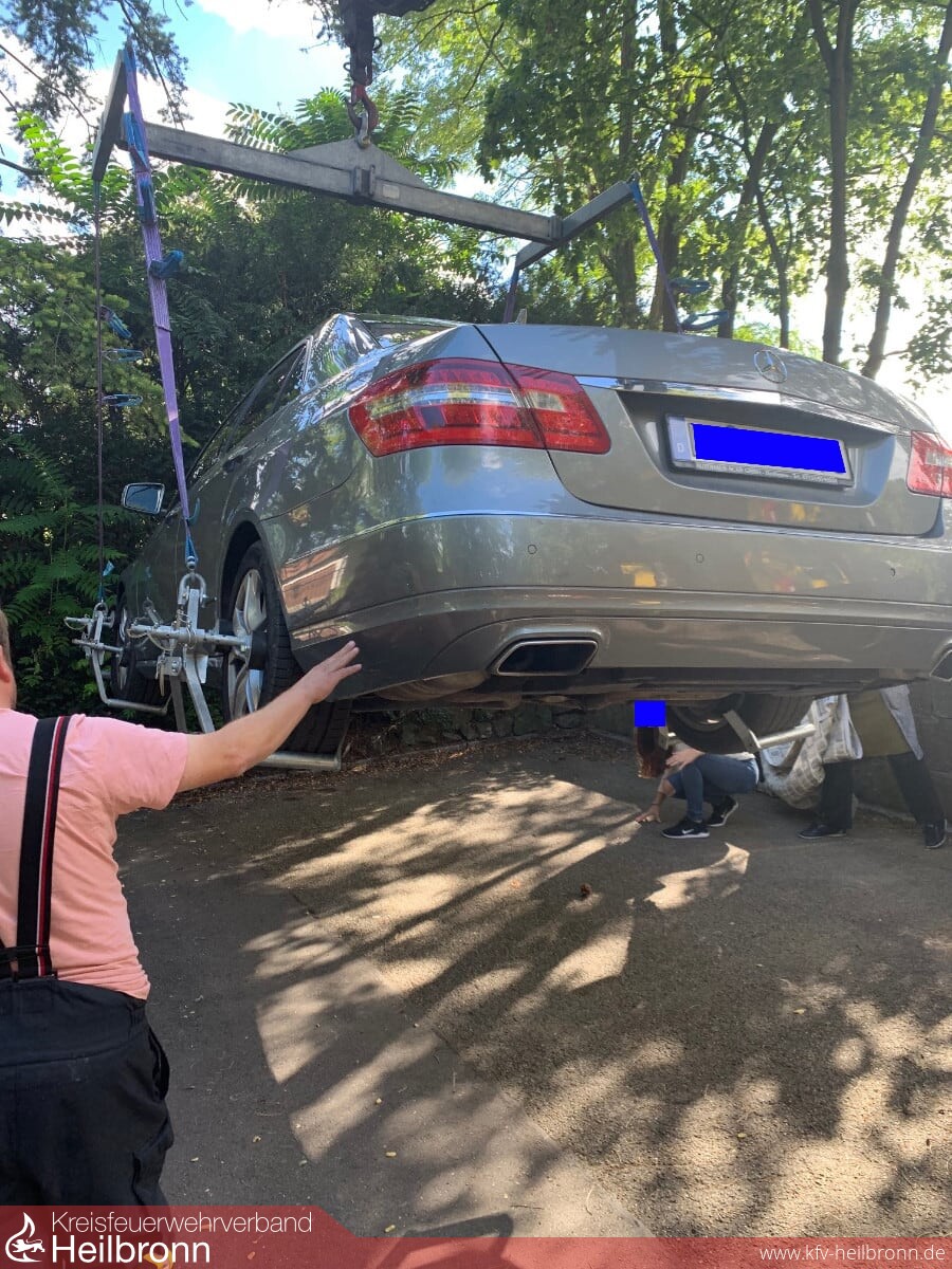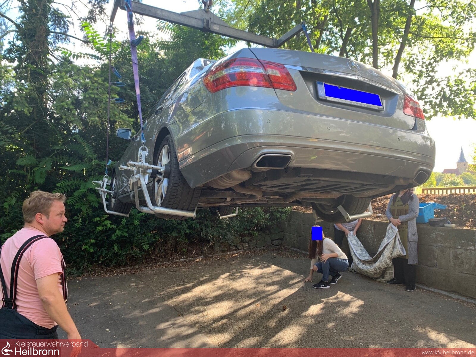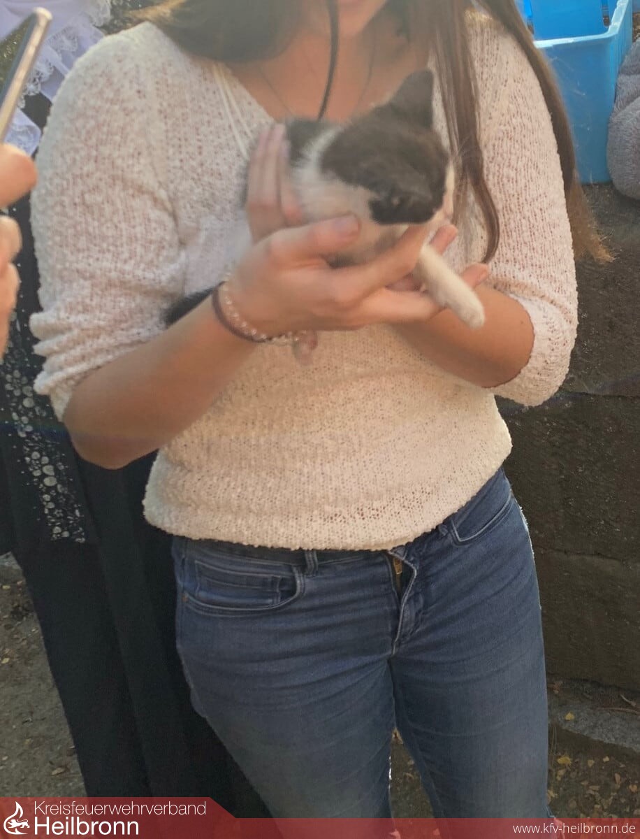 Das Abschlepp- und Bergeunternehmen Schneider war mit einem Fahrzeug schnell vor Ort und konnte mittels einer Kraneinrichtung den PKW vorsichtig anheben. Anschließend wurde mit der Demontage des Unterfahrschutzes begonnen. Der Eigentümer des Fahrzeugs war ebenfalls vor Ort und beobachtete die Arbeiten an seinem Fahrzeug genau. Nachdem die Teile des Fahrzeugs demontiert waren, konnte man das Katzenbaby schließlich sehen. Dennoch war die Katze nach wie vor hinter verschiedenen Bauteilen des Fahrzeugs versteckt. Mit etwas Geschick und Fingerspitzengefühl konnte man das Katzenbaby schließlich greifen und aus der misslichen Lage befreien. Das Tier war wohlauf und konnte zur weiteren Betreuung in gute Hände gegeben werden. Auch der Eigentümer des Fahrzeugs war zufrieden, da an dem PKW keinerlei Schaden entstanden ist. Dank der gemeinsamen Zusammenarbeit der Feuerwehrkräfte und der Firma Schneider verlief der Einsatz reibungslos.