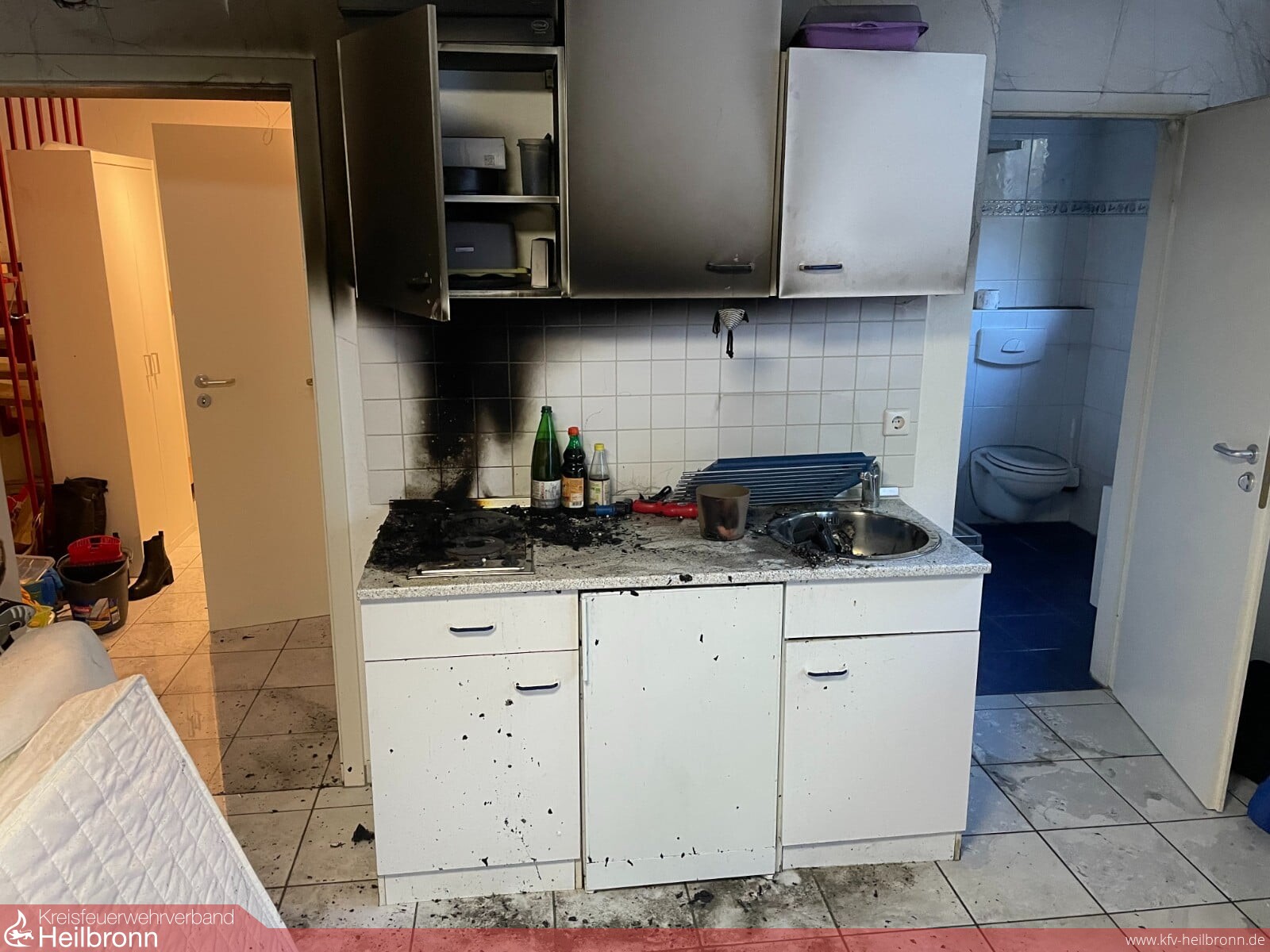 Die Feuerwehr Neckarwestheim und der Löschzug Lauffen wurden zu einem Kellerbrand alarmiert. Vor Ort stellte sich heraus, dass Gegenstände auf dem Herd im Untergeschoss brannten. Die dort befindliche Einliegerwohnung war einerseits über eine Außentüre und andererseits über eine Türe im Treppenhaus der Doppelhaushälfte erreichbar. Der Brand wurde von den beiden Kindern bemerkt, die zu dem Zeitpunkt alleine in dem Haus waren. Noch vor der Feuerwehr eilte der Großvater der Kinder herbei. Beim Eintreffen der Feuerwehr befand sich der Mann im Untergeschoss des Gebäudes und unternahm einen Löschversuch, während sich im Obergeschoss noch ein Hund befand. Als der erste Trupp gerade unter Atemschutz zur Menschenrettung vorging, kam ihnen der Mann entgegen und konnte sich mit eigenen Kräften aus dem Haus retten. Im weiteren Verlauf waren zwei Trupps unter Atemschutz sowohl zur Brandbekämpfung im Untergeschoss als auch zur Tierrettung im Obergeschoss im Einsatz. Auch der Hund konnte wohlbehalten gerettet werden, der Mann und die Kinder wurden in eine Klinik gebracht. Nachdem der Brand vollständig gelöscht und Belüftungsmaßnahmen im gesamten Haus durchgeführt waren, konnte das Haus der zwischenzeitlich eingetroffenen Bewohnerin übergeben werden.