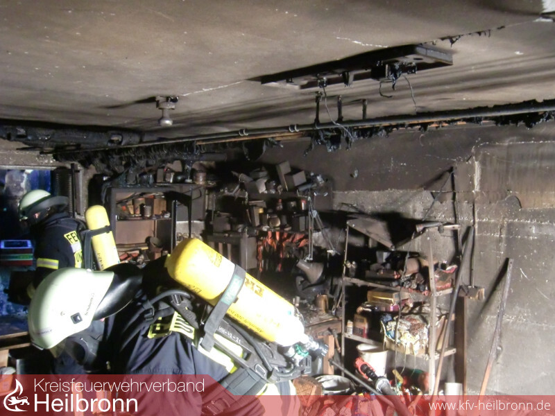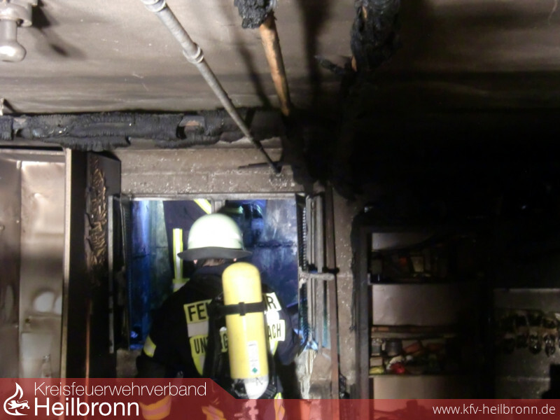 Die alarmierten Kräfte der Gesamtwehr Untergruppenbach trugen ein Löschangriff über 2 C-Rohre unter Pressluftatmer in die Kellerräume vor. Aufgrund der massiven Rauchentwicklung geschah dies für die eingesetzten Trupps bei Sichverhältnissen gleich null. Über die Wärmebildkamera konnte der Brandherd trotz diesen Umständen zügig erkundet und der Brand rasch unter Kontrolle gebracht werden.
