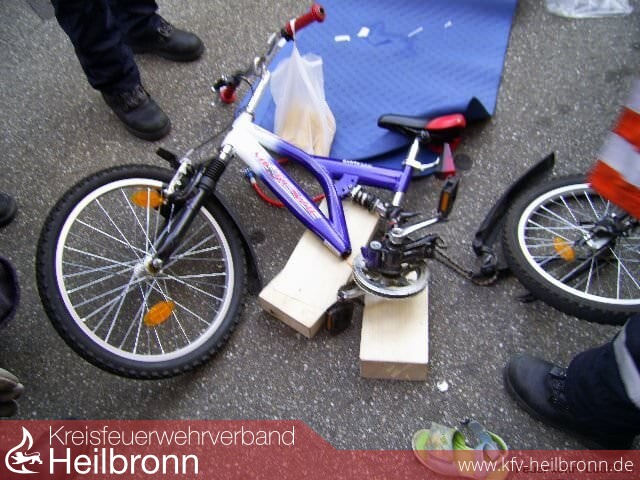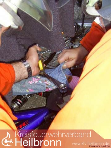 Da sich das Kind nicht selbst aus dieser schmerzhaften Lage befreien konnte, wurde der Fahrradrahmen von der Feuerwehr mit Hilfe des Pedalschneider zerlegt. Zuvor wurde das Kind durch den Notarzt medikamentös behandelt.
