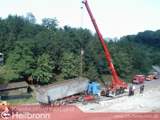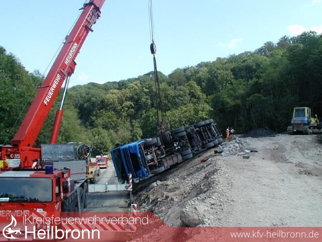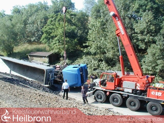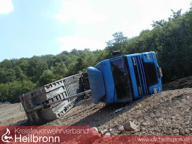Ein mit Kohlestaub beladener Kippsattelzug stürzte beim Entladen auf der Mülldeponie Vogelsang an einer steil abfallenden Böschung um. Der Fahrer verletzte sich dabei leicht. Auslaufender Diesel und Hydrauliköl wurden von der Feuerwehr aufgefangen. Aufgrund der räumlichen Enge und des unwegsamen Geländes mussten Planierraupen zur Sicherung des Sattelzuges eingesetzt werden. Der ausgefahrene Aufrichtzylinder wurde abgelassen und mit dem Feuerwehrkran konnte der komplette Sattelzug auf die Räder gestellt werden.