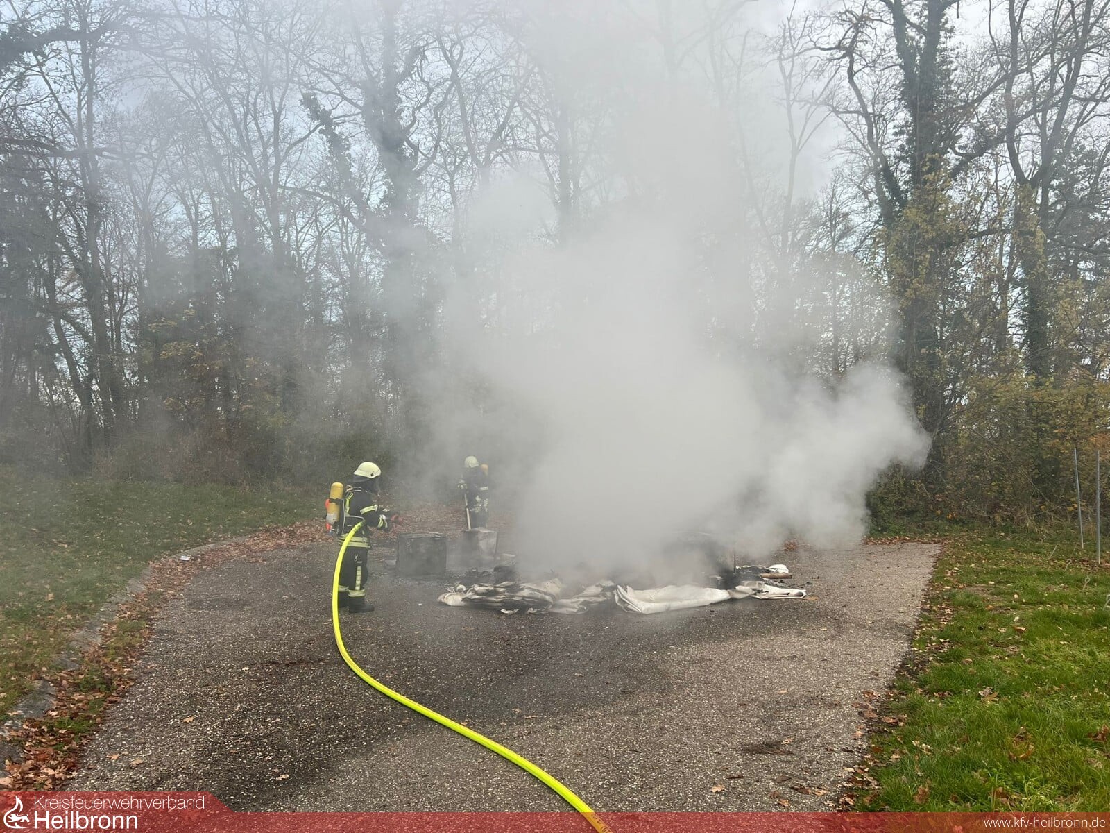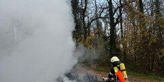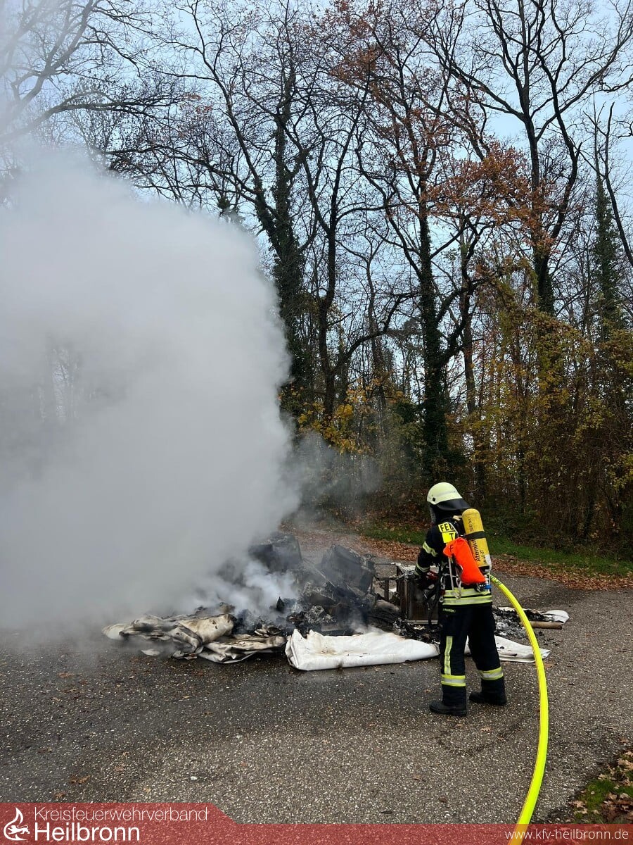 Am 23.11.2025 um 08:26 Uhr wurde die Feuerwehr Talheim zu einem gemeldeten Kleinbrand ins Gewann Hörnlesbrunnen alarmiert. Der Einsatzort befand sich tief im hinteren Bereich des Haigernwaldes, wo sich bereits beim Eintreffen eine deutliche Rauchentwicklung zeigte. Vor Ort stellte sich heraus, dass Unbekannte illegal verschiedene Materialien – darunter alte Haushaltsgeräte, größere Mengen Bauschutt und mehrere LKW-Planen – rücksichtslos im Wald abgeladen und anschließend in Brand gesetzt hatten.