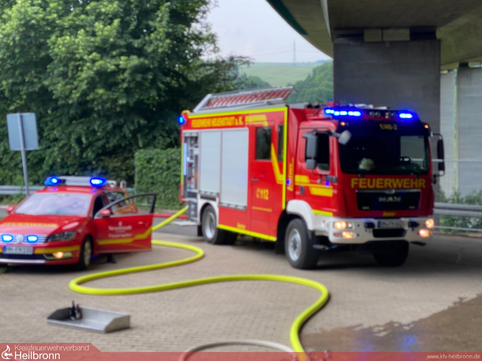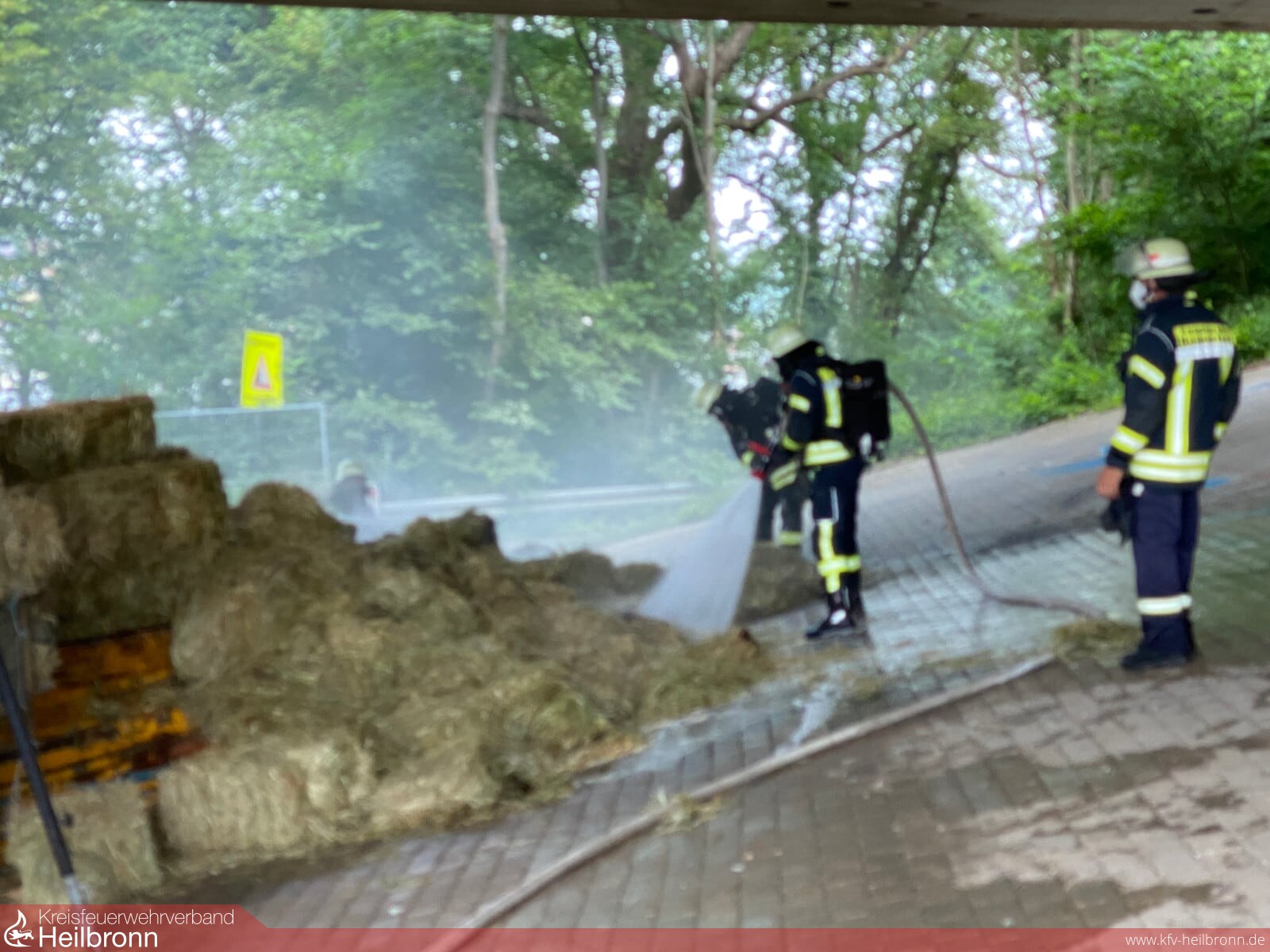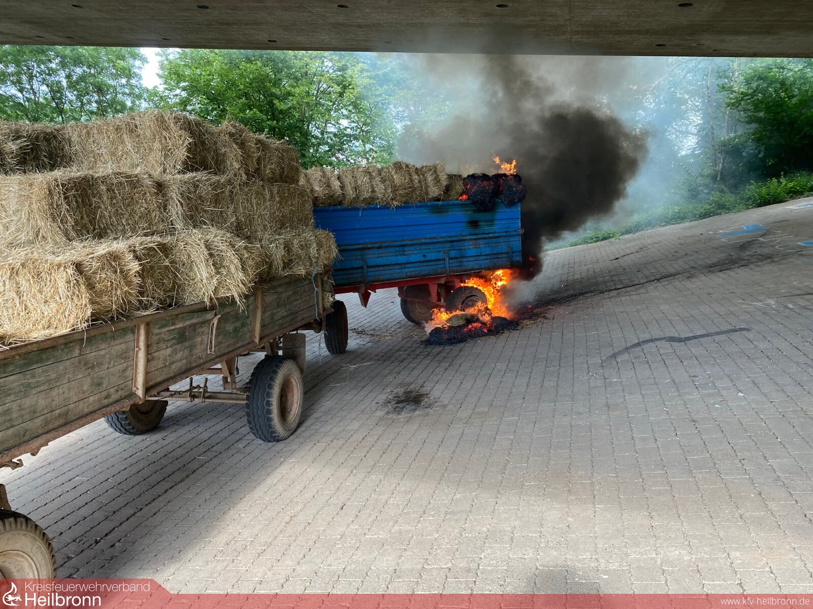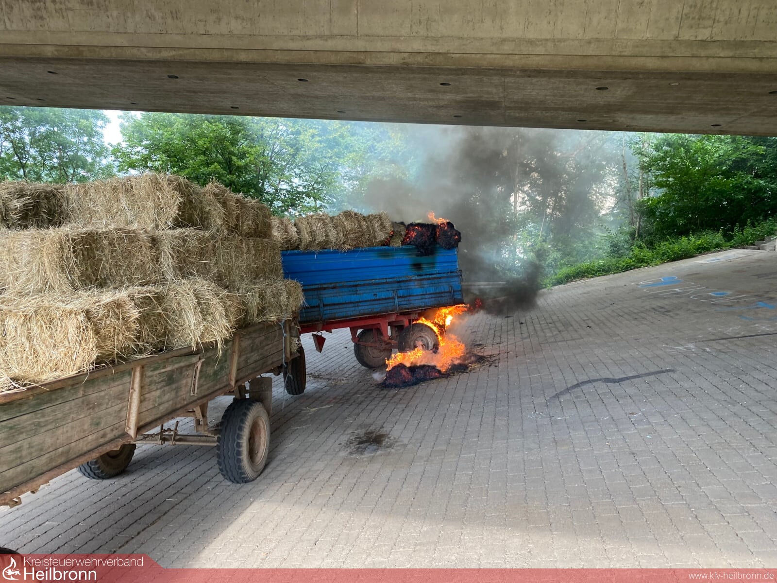 Zwei landwirtschaftliche Anhänger im Zug verbunden, standen mit frischen Heuballen beladen unter der Autobahnbrücke der A81, in Verlängerung der Industriestraße. An der Hinterseite des Anhängers brannte die Ladung mit Heuballen, der Anhängerreifen brannte ebenfalls. Vermutlich hatte er sich durch herabfallende Heuballen entzündet. Der Abstand zur Unterkante der Autobahnbahnbrücke beträgt an dieser Stelle nur wenige Meter, so dass ein ausgedehnter Brand die Struktur der Betonkonstruktion beschädigen könnte. Der Brand konnte jedoch sehr schnell gelöscht werden, da die Wasserversorgung durch Hydranten in diesem Bereich gegeben war. Die Ladung wurde mittels Dunghaken vom Hänger heruntergezogen und großflächig verteilt, um alle Glutnester ablöschen zu können. Polizei und Besitzer des Anhängerzugs wurden verständigt und zur Einsatzstelle angefordert.