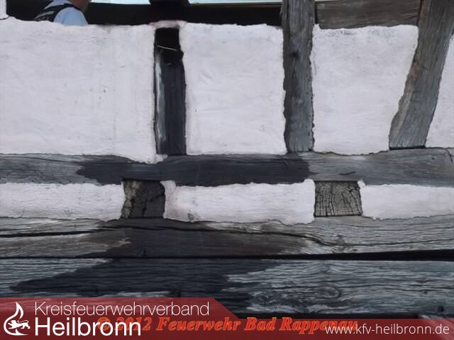 An der Fachwerkfassade eines alten Gebäudeteils, welches als Treppenaufgang und Veranda genutzt wird, brannten Holzbalken und Teile der Ausfachung.