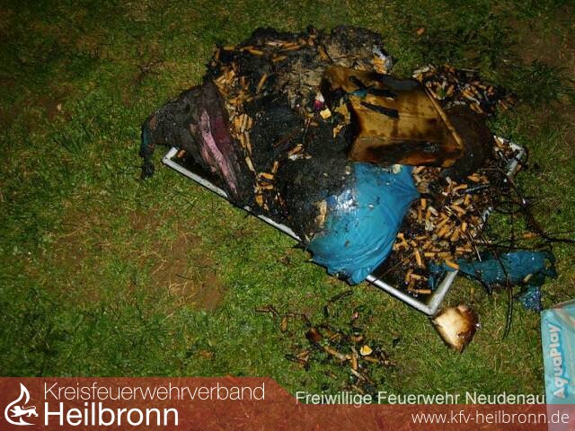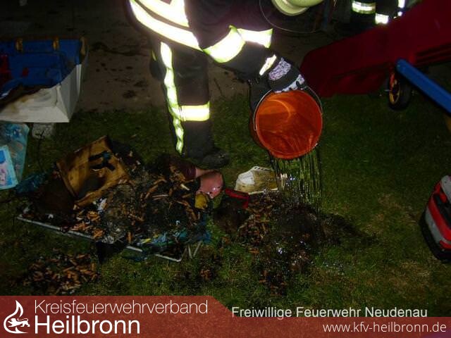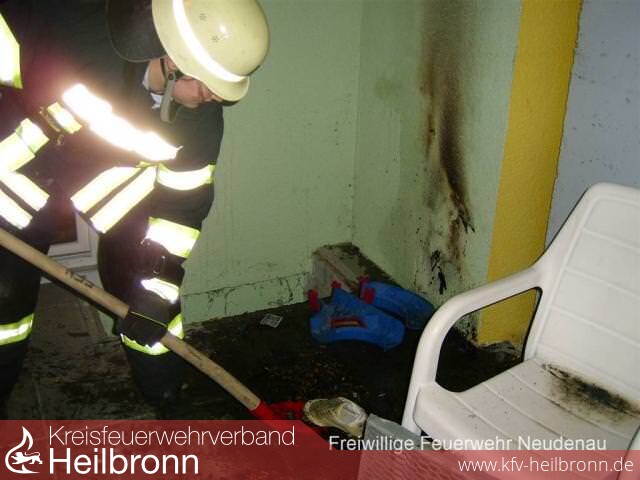 Nach Eintreffen des Kommandowagens (KdoW) konnte Entwarnung gegeben werden. Tatsächlich hatte ein Abfallbehältnis auf der Terrasse gebrannt. So konnten sofort alle alarmierten Kräfte, außer dem Neudenauer Tanklöschfahrzeug (TLF 16/25), entlassen werden. Der Abfall wurde durch Kräfte des TLF 16/25 abgelöscht und mit einer Schuttmulde entfernt.