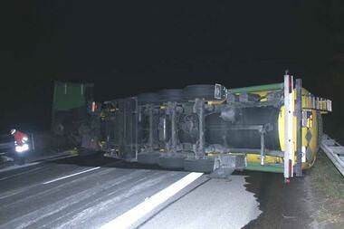 Glück im Unglück hatte der Fahrer eines Sattelschleppers bei einem Unfall am Donnerstagabend auf der A6 nahe des Weinsberger Kreuzes. Obwohl der mit Lösungsmittel gefüllte Auflieger seines Lasters umkippte, wurde der Mann nicht verletzt und nur eine geringe Menge des gefährlichen Stoffes lief aus.