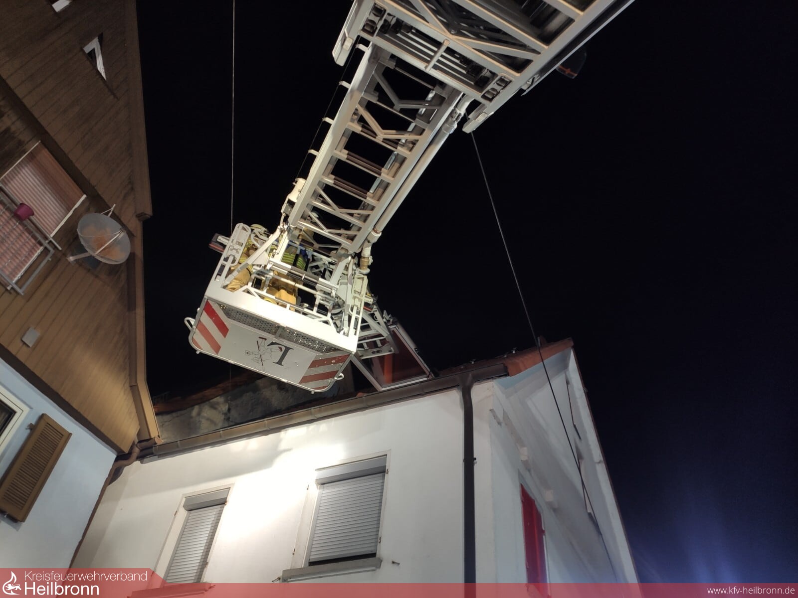 Aufgrund der Enge des Treppenhauses des alten Gebäudes war dies nicht per Trage oder Tragestuhl möglich. Jedoch gestaltete sich auch die Stellplatzsuche für die Drehleiter herausfordernd, da sich im 2. OG, welches eigentlich bereits das erste Dachgeschoss ist, nur ein zugängliches und größeres Fenster befindet. Die einzige Möglichkeit bestand daher in einer Zufahrt von der Rückseite des Gebäudes von einer Parallelstraße aus, wobei genau in diesem Bereich eine unisolierte Freileitung der Straßenbeleuchtung verläuft.
