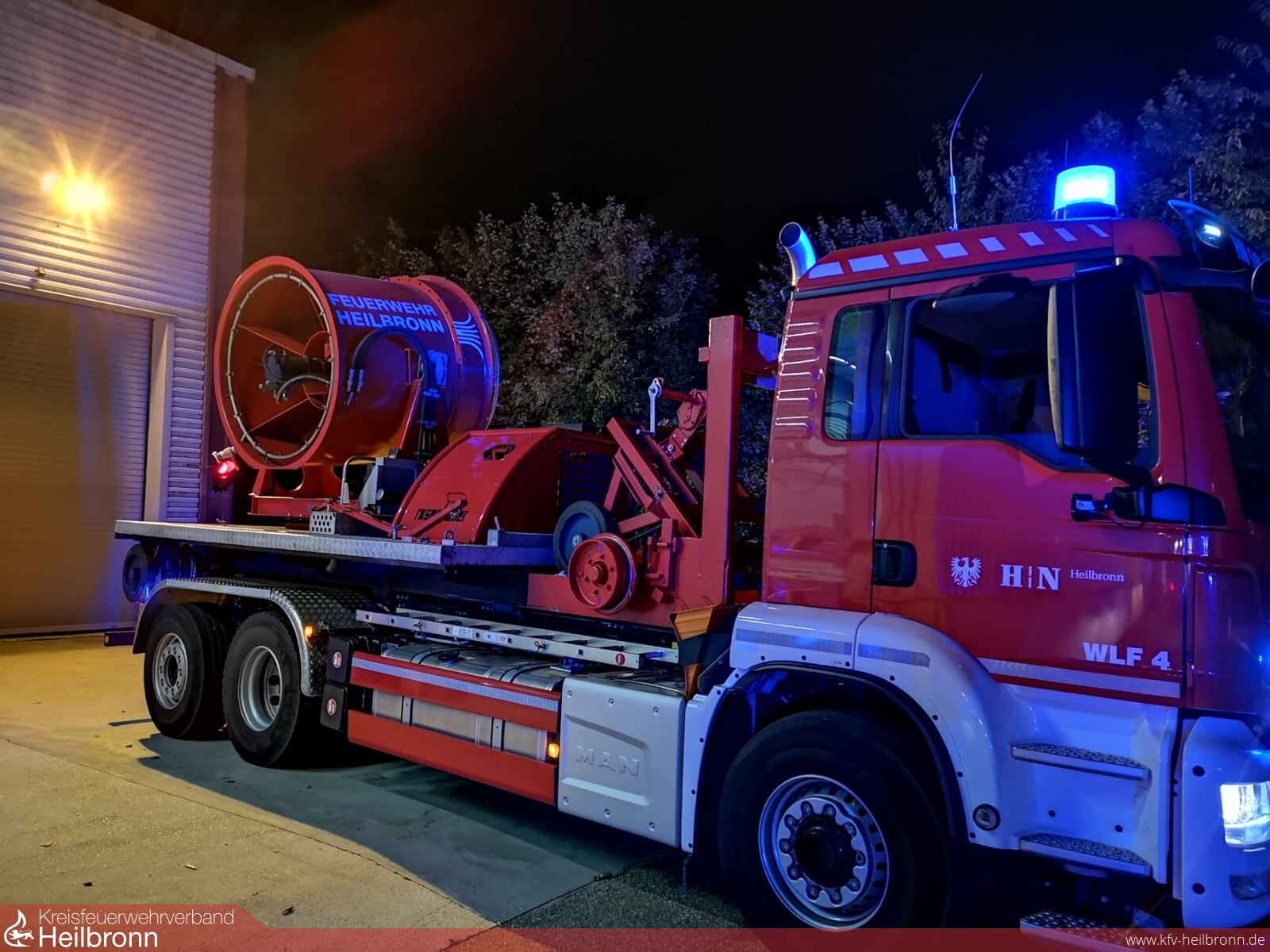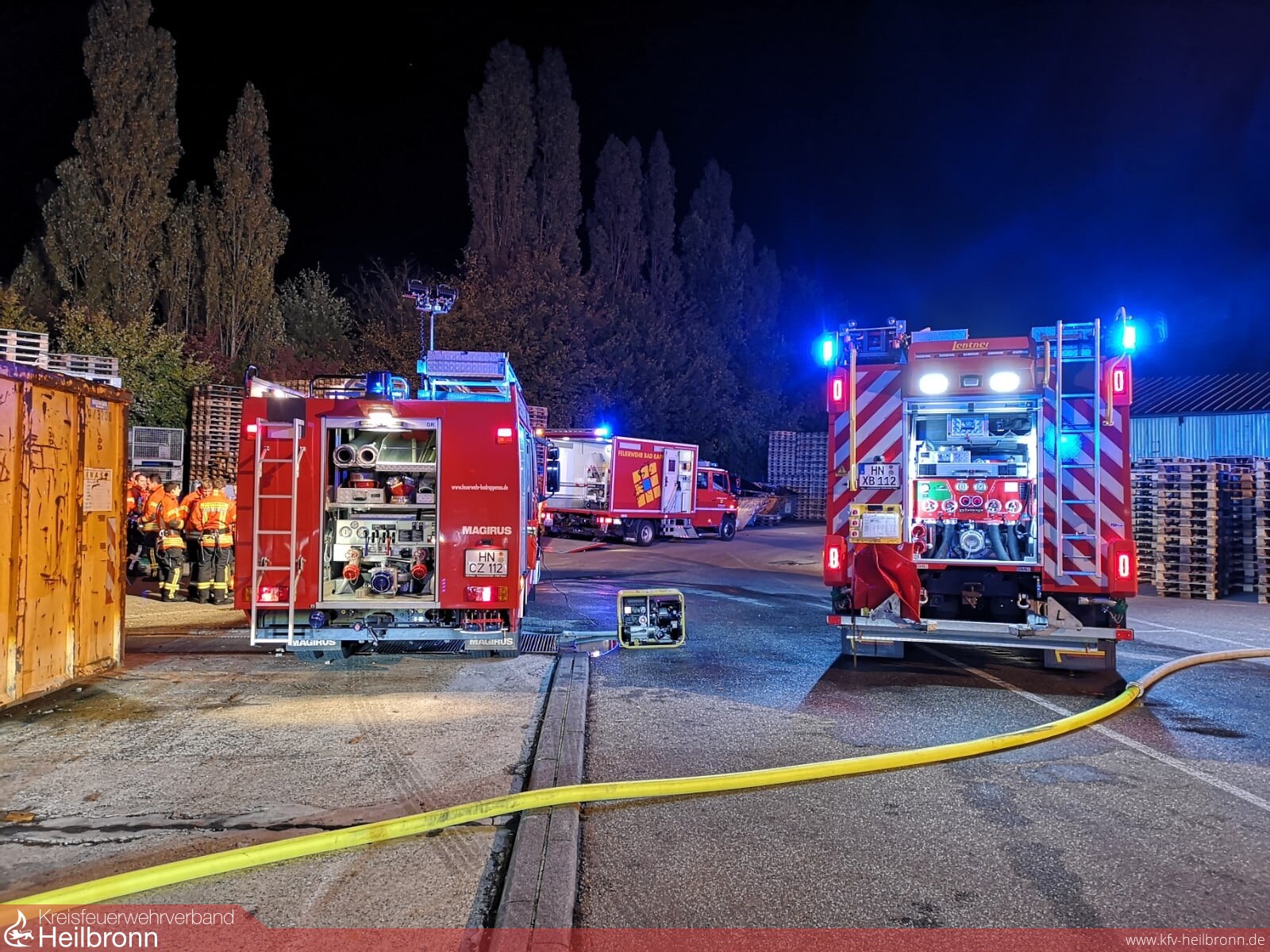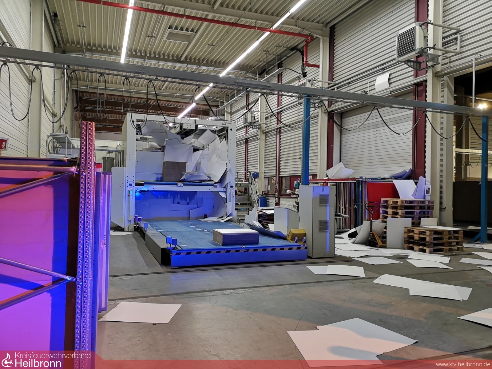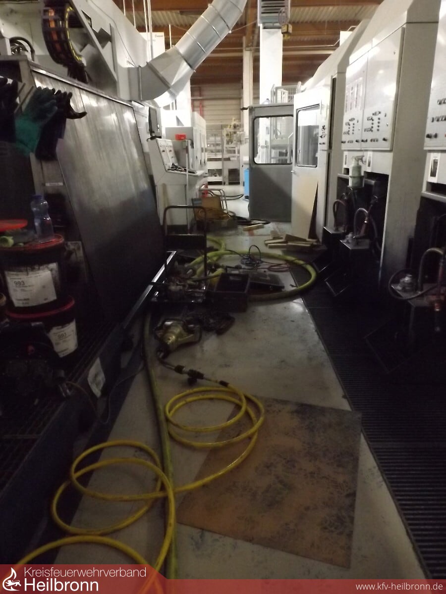 Nach der ersten Erkundung und ersten Löschmaßnahmen wurde klar, dass die Maschinenteile bewegt werden müssen, um das Feuer zu löschen. Durch den Einsatzleiter wurden u.a. der Rüstwagen, die Atemschutzlogistik, der ELW 1 und der mobile Großventilator der Feuerwehr Heilbronn alarmiert.