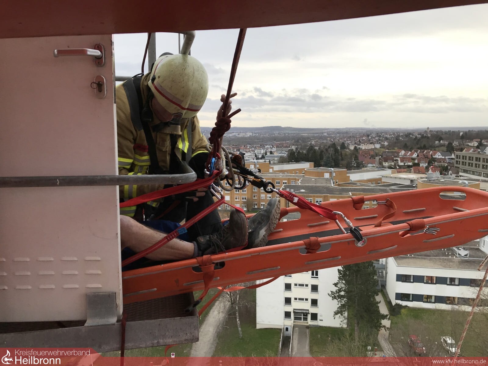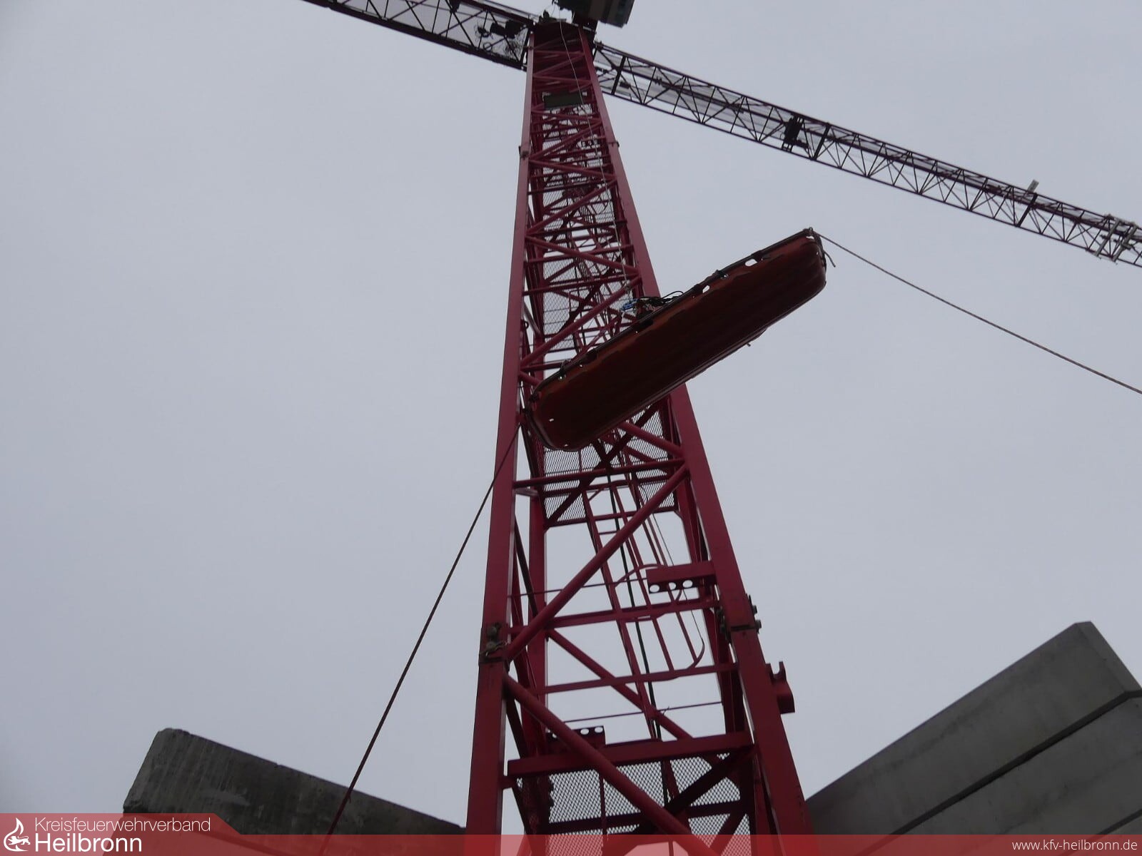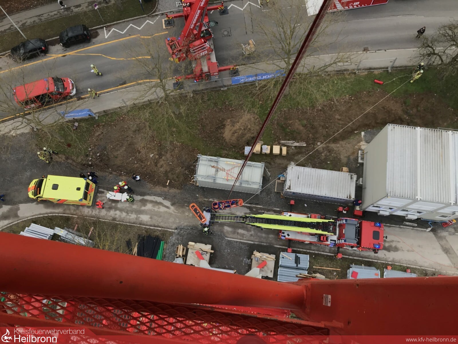 Der Kranführer war aus medizinischen Gründen zusammengebrochen und hierbei mit seinem rechten Fuß umgeknickt. Eine Rettung der hilflosen Personen mit der Drehleiter war aufgrund der Höhe nicht möglich. Somit erfolgte eine patientengerechte Rettung mittels Seiltechnik und einer Schleifkorbtrage. Die ungünstigen Windverhältnisse auf dem Kran erschwerten die Rettungsmaßnahmen. Mit Hilfe von Halteseilen konnte die Trage vom Boden aus stabilisiert und der Verletzte sicher abgelassen werden.