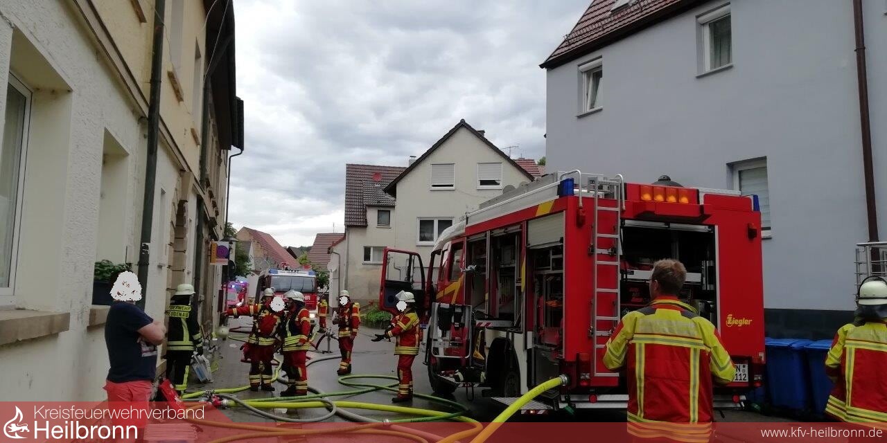 Sofort wurde mit einem C-Rohr im Innenangriff die Brandbekämpfung aufgenommen. Ein zweiter Trupp ging mit einem weiteren Rohr ins Dachgeschoss vor. Aufgrund der Gefahr, dass das Feuer auf das Dachgeschoss und das Dach übergreifen könnte, wurde die Drehleiter der Feuerwehr Möckmühl nachgefordert, die aber nicht mehr zum Einsatz kommen musste.