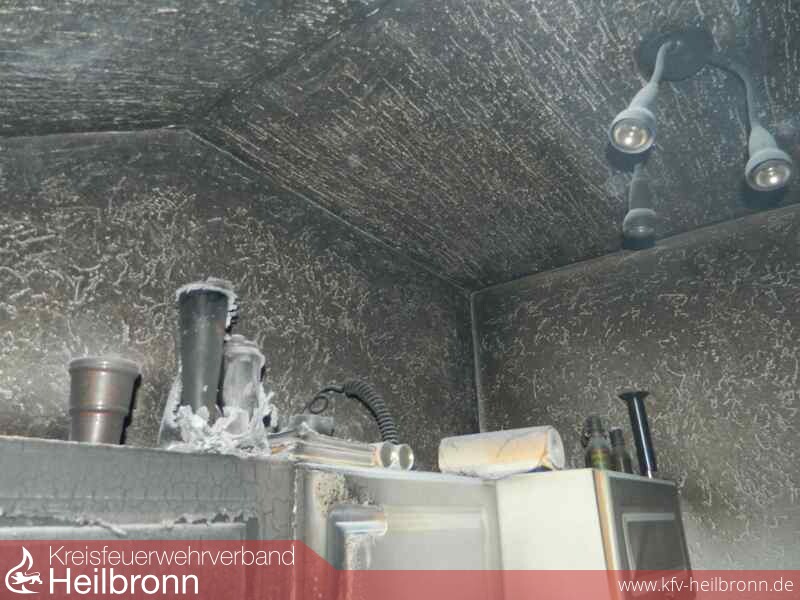 Die Kücheneinrichtung sowie die Decken und Wände der Wohnung wurden durch die Hitze- und Rußeiwirkung stark in Mitleidenschaft gezogen.