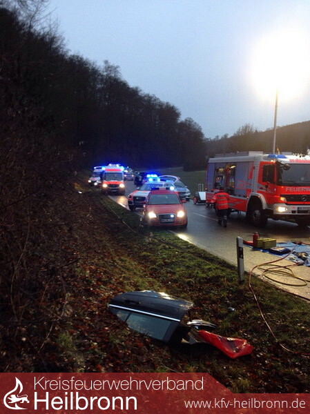 Zu einem Verkehrsunfall mit mehreren eingeklemmten Personen wurden die Feuerwehren Möckmühl und Roigheim auf die L 1095 gerufen.