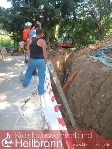 Kurz nach 16 Uhr bemerkten der Baggerfahrer sowie sein Kollege einen starken Gasgeruch, nachdem Sie bei Baggerarbeiten auf einem privaten Grundstück auf eine Leitung trafen. Die von der Anwohnerin darauf verständigte Feuerwehrleitstelle in Heilbronn alarmierte daher um 16:11 die Kleinschleife der Feuerwehr Leingarten.