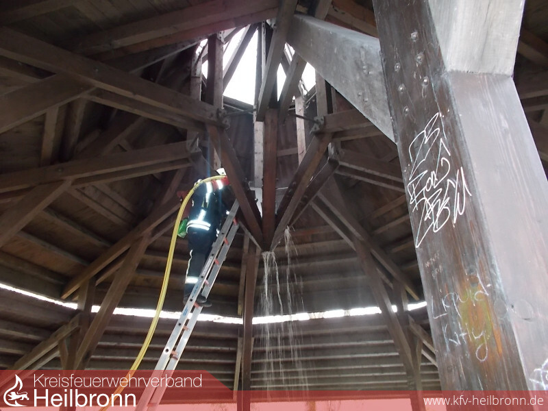 Gegen 14.28 Uhr bemerkte die Frau den Rauch an der Holzkonstruktion und informierte die Integrierte Leitstelle über den Euronotruf 112.