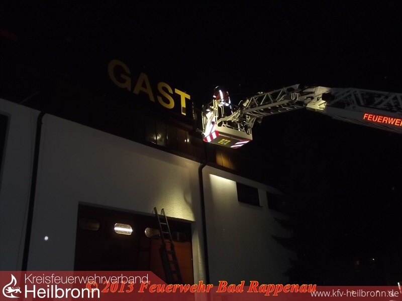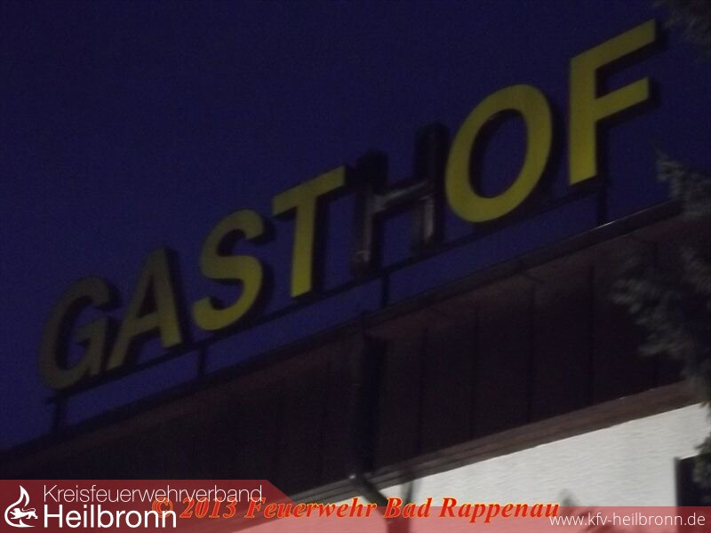 Der NEF-Fahrer, welcher in der Nachbarschaft der Gaststätte im Einsatz war, meldete eine brennende Leuchtreklame an die Integrierte Leitstelle. Kurz darauf alarmierte die ILS die zuständige Abteilung Bad Rappenau mit der „kleinen Nachtschleife“.