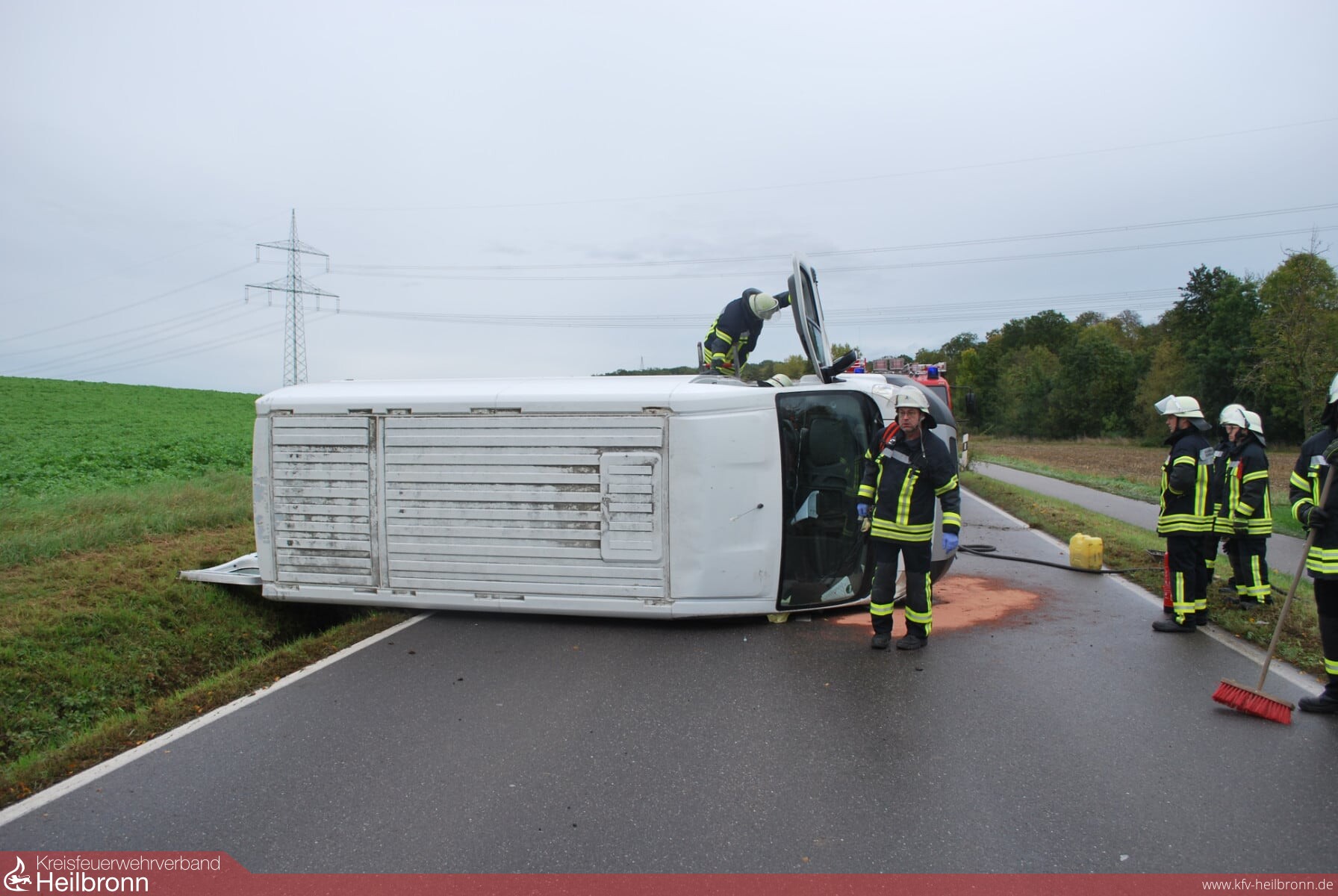 Von den als erstes eingetroffen Einsatzkräften konnten die Fahrzeuginsassen, eine erwachsene Person und ein Kind mit Hilfe einer Leiter über die Beifahrertüre befreit werden. Sie wurden dann bis zum Eintreffen des Rettungsdienstes von Feuerwehrkräften betreut. Der Großteil der auf der Anfahrt befindlichen Kräfte konnte daraufhin die Anfahrt abbrechen. Die weitere Tätigkeit der Feuerwehr beschränkte sich auf Sicherungsmaßnahmen am Unfallfahrzeug.