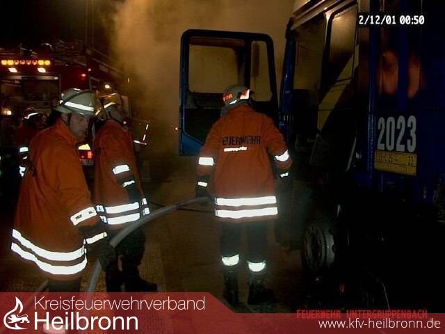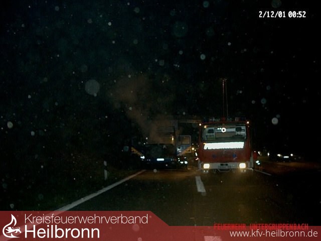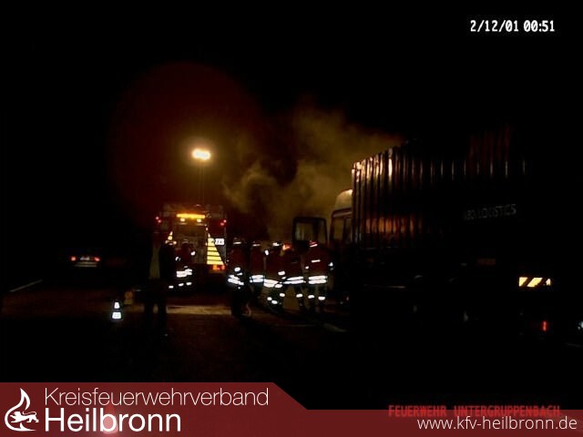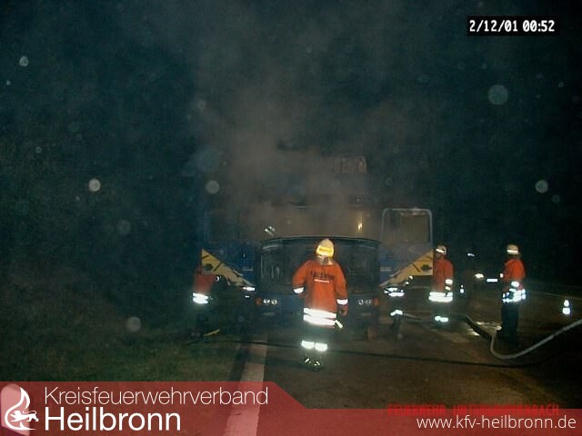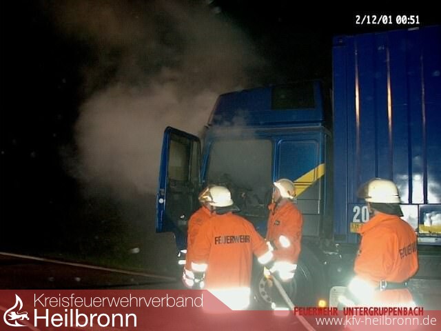 Am Freitag, den14.10.2005, wurde die Feuerwehr Untergruppenbach gegen 21.35 Uhr über Funkmeldeempfänger mit dem Stichwort - LKW-Brand - alarmiert. Auf der BAB 81 in Fahrtrichtung Würzburg brannte kurz vor der Anschlußstelle Weinsberg das Führerhaus eines LKW-Gespanns in voller Ausdehnung. Nach eintreffen des Kommandowagens konnte mittels Highpressgerät und Feuerlöscher der Brand soweit unter Kontrolle gehalten werden, dass er nicht auf die Ladung übergreifen konnte. Nach eintreffen des TLF 16/25 wurde ein gezielter Löschangriff mit einem C-Rohr und einem Schwerschaumrohr vorgetragen und die Gefahr einer weiteren Ausdehnung somit entgültig verhindert. Ein Problem bei der Brandbekämpfung stellte allerdings die defekte Vorrichtung zum kippen des Führerhauses dar. Hierdurch war es nur schwer möglich, zu den immer wieder aufflammenden Glutnestern im inneren Bereich des LKW´s zu gelangen. Nach dem eintreffen des Abschleppdienstes konnte mittels Zugeinrichtung das Führerhaus geneigt und die restlichen Brandherde abgelöscht werden.