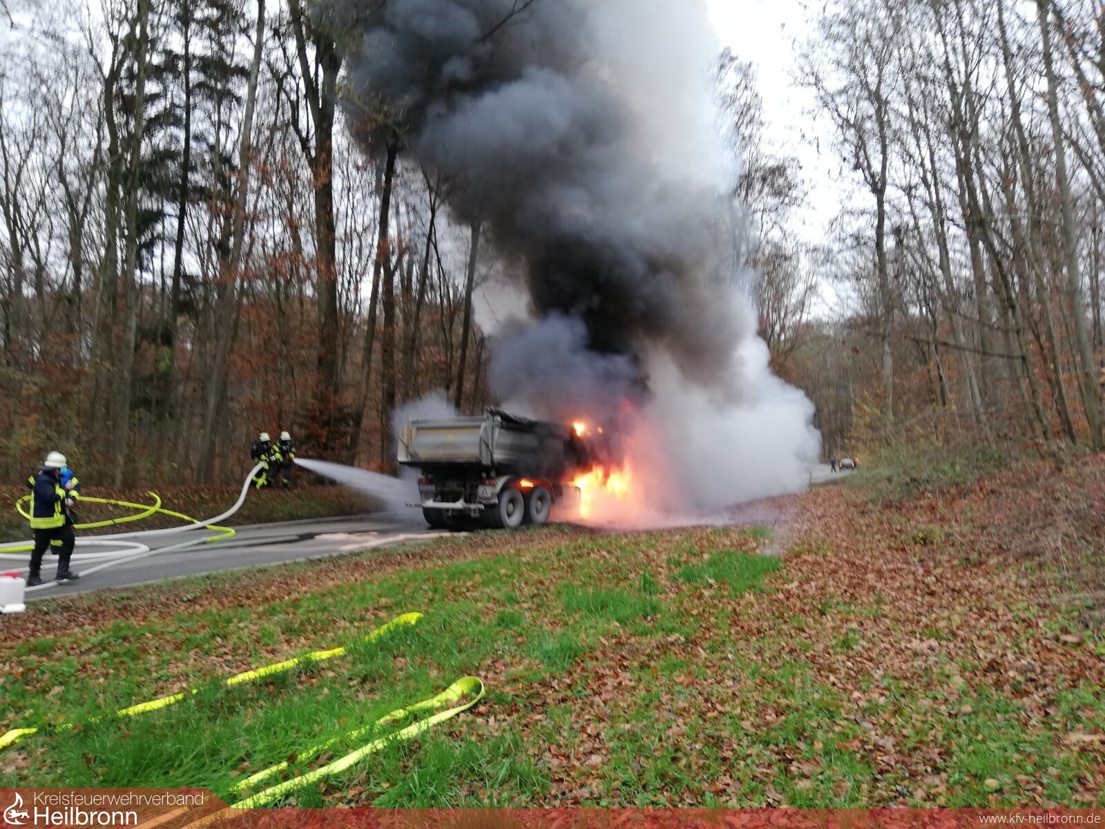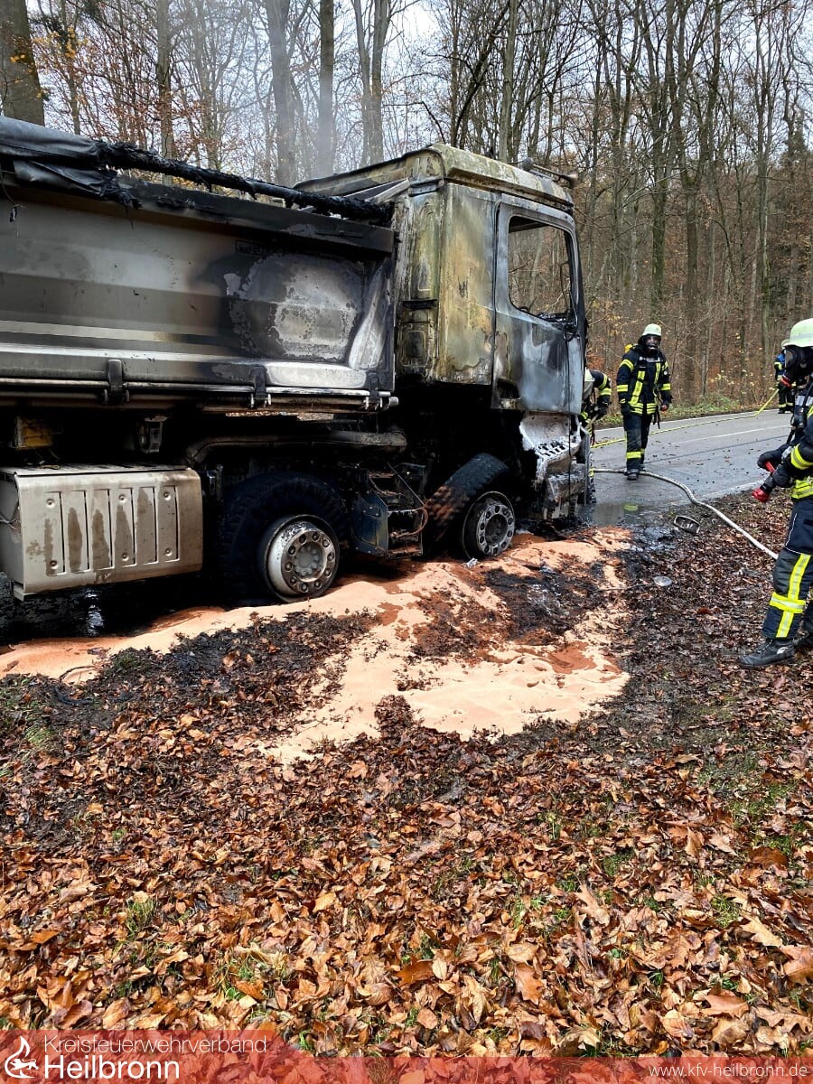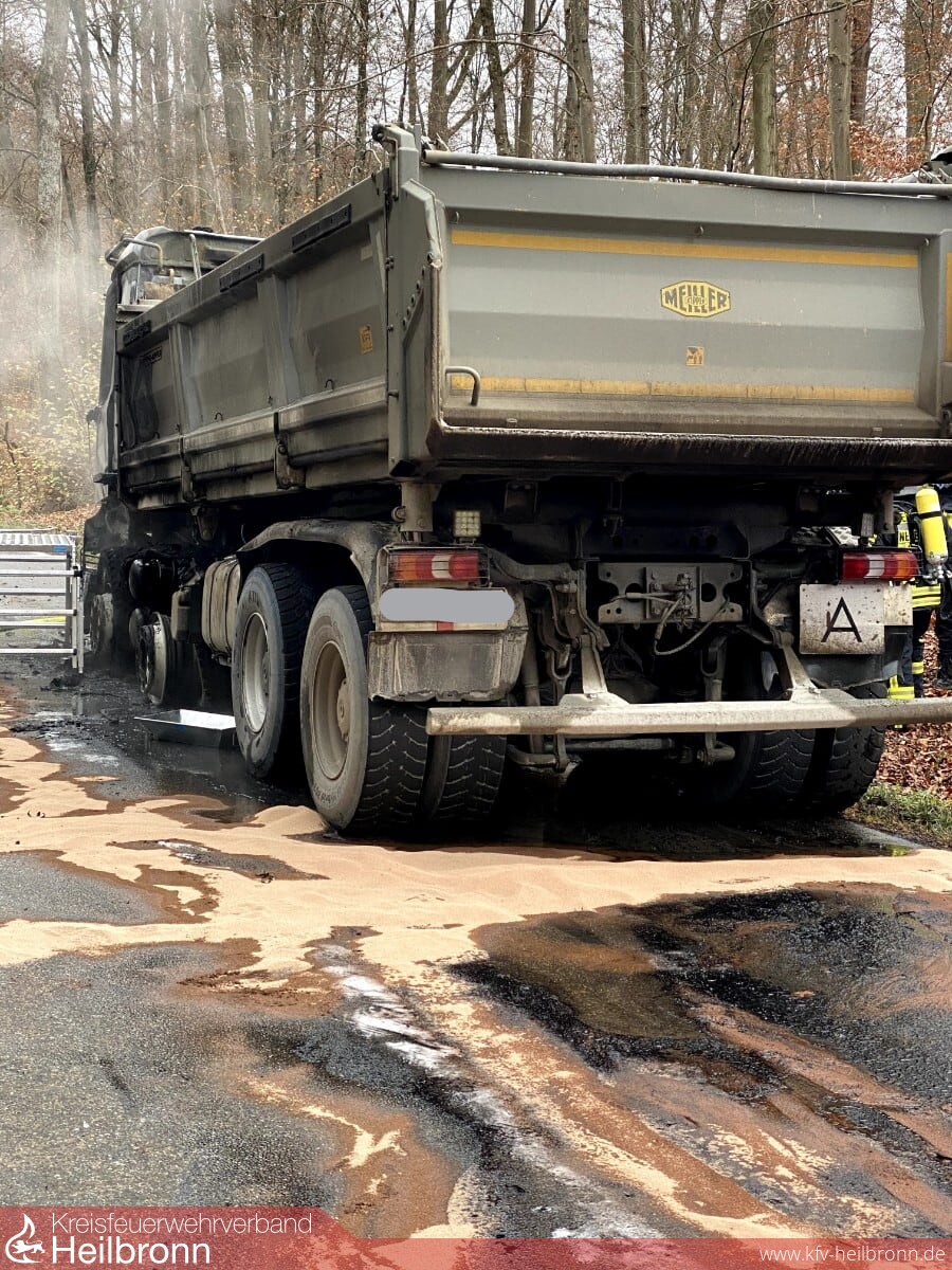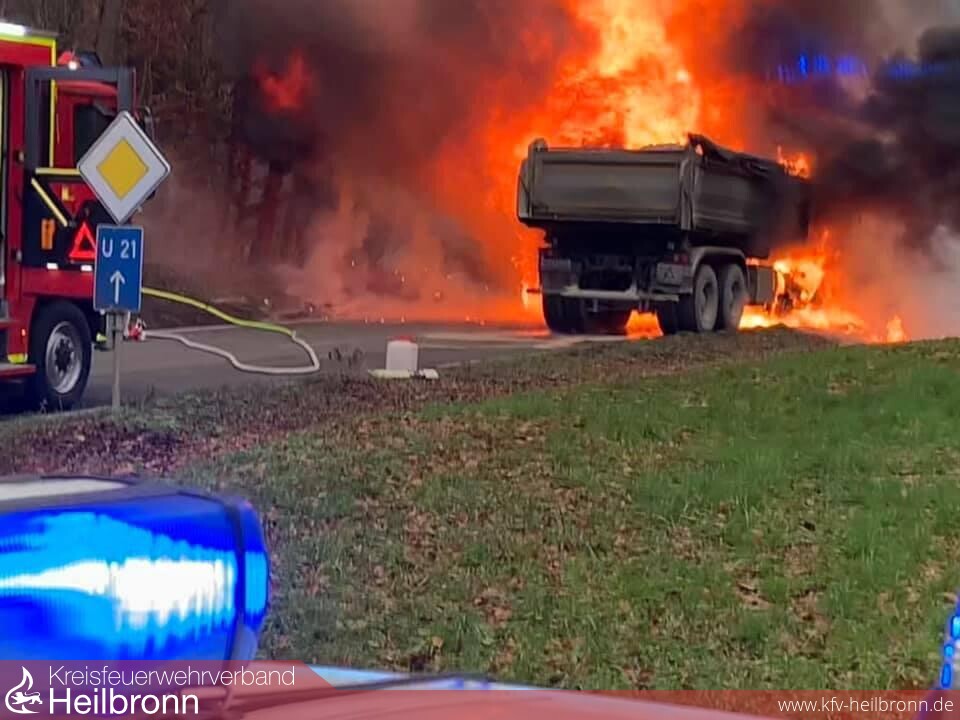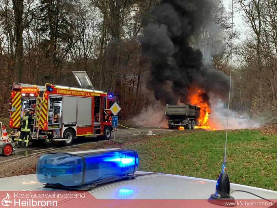 Die Feuerwehr Neuenstadt wurde zu einem LKW-Brand auf die L1095 zwischen Bürg und Züttlingen alarmiert. Das Fahrerhaus und der Motor brannten beim Eintreffen des Löschzugs bereits in voller Ausdehnung. Zwei LKW-Reifen der Vorderachse waren bereits auf Grund der enormen Hitze geplatzt und verteilten sich brennend am Waldrand. Der Fahrer des mit Steinen beladenen Kippers konnte sich rechtzeitig in Sicherheit bringen.