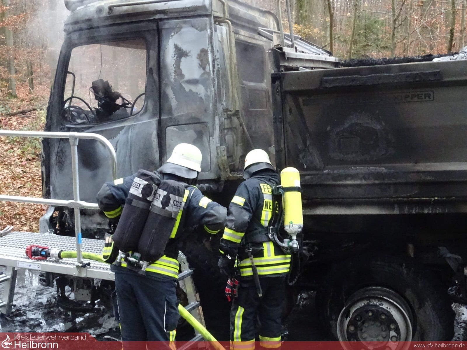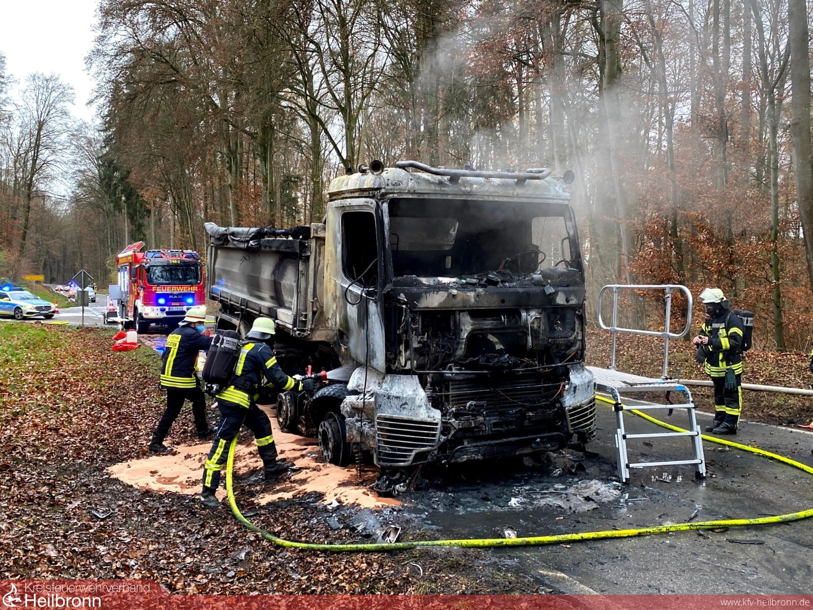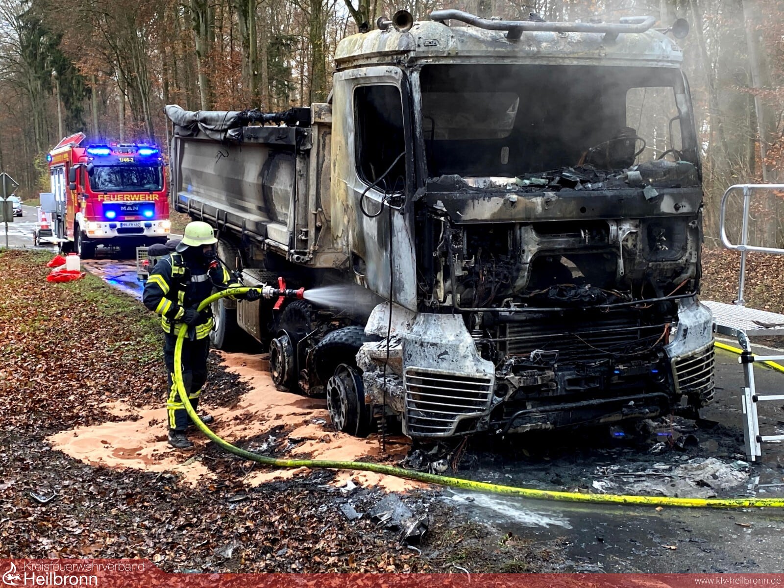 Die Feuerwehr Neuenstadt wurde zu einem LKW-Brand auf die L1095 zwischen Bürg und Züttlingen alarmiert. Das Fahrerhaus und der Motor brannten beim Eintreffen des Löschzugs bereits in voller Ausdehnung. Zwei LKW-Reifen der Vorderachse waren bereits auf Grund der enormen Hitze geplatzt und verteilten sich brennend am Waldrand. Der Fahrer des mit Steinen beladenen Kippers konnte sich rechtzeitig in Sicherheit bringen.