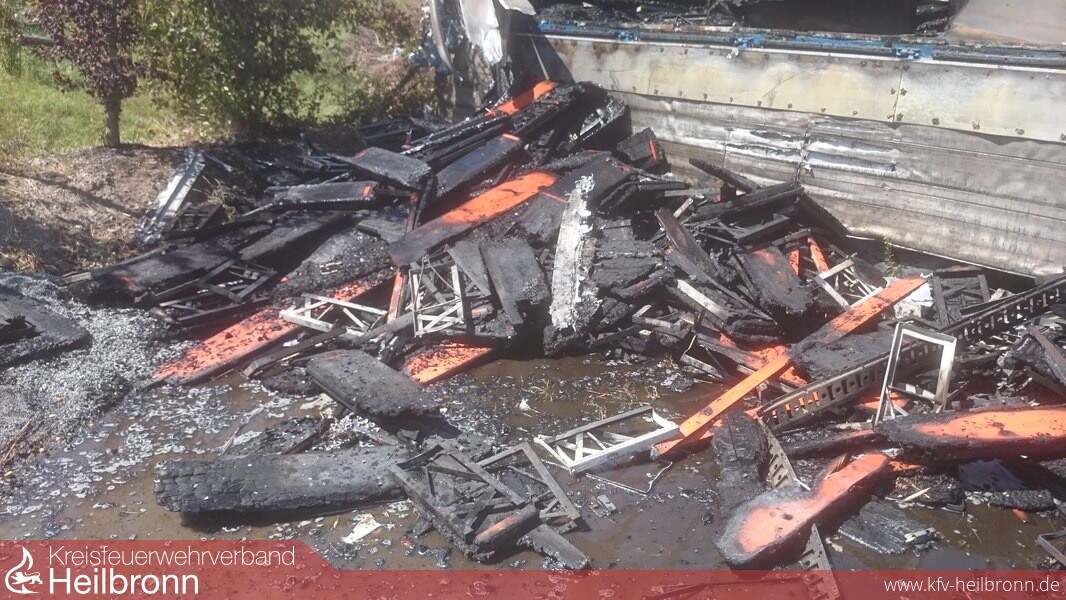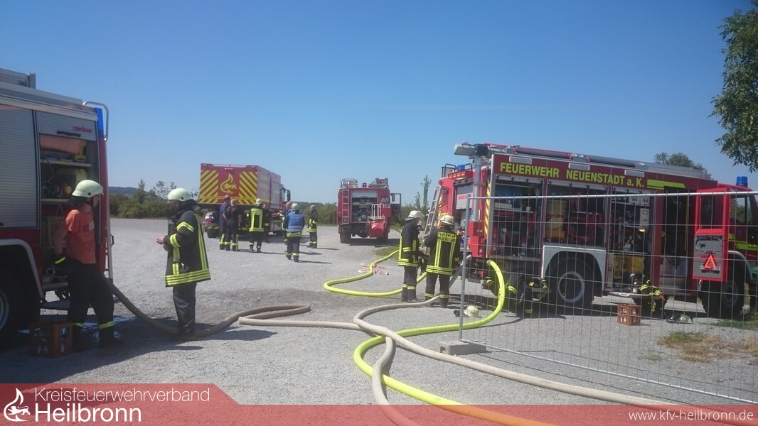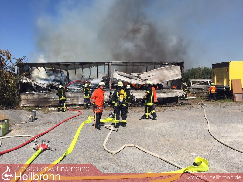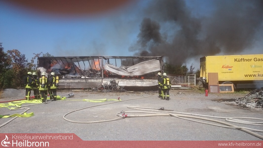 Ein LKW-Anhänger geriet am Montagmittag auf dem Gelände eines Reiterhofs in Langenbrettach-Neudeck in Brand. Nach den ersten Ermittlungen der Polizei sind offensichtlich in der Nähe eines LKW-Anhängers, auf dem Brauereigarnituren gelagert wurden, alte Balken verbrannt worden. Kurz vor 13 Uhr hat dann vermutlich ein Windstoß Glutstücke auf den Anhänger geweht, der samt seiner Ladung in Brand geriet und komplett ausbrannte. Ein Ausbreiten der Flammen konnte durch die Freiwilligen Feuerwehren Langenbrettach und Neuenstadt verhindert werden. Auf dem Anhänger befanden sich über 60 Biergarnituren. Der Gesamtsachschaden wird auf rund 5.000 Euro geschätzt.