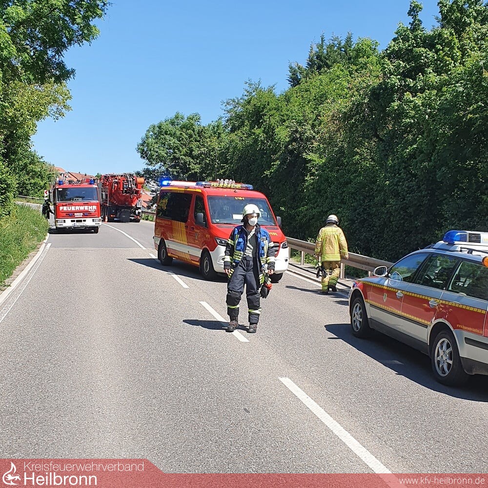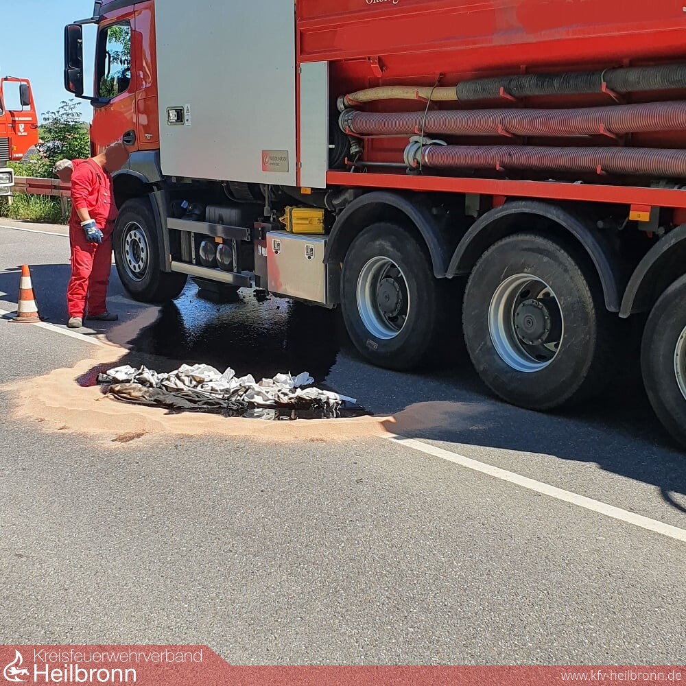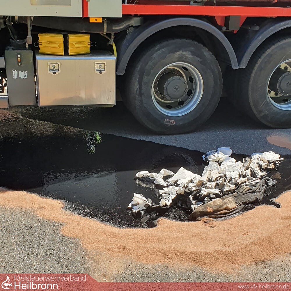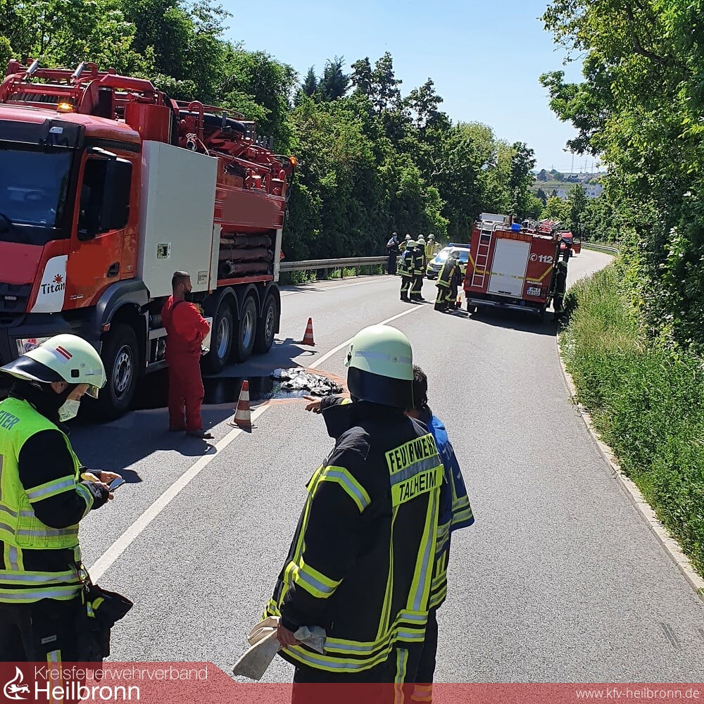 Vom der Feuerwehr Talheim wurde die Einsatzstelle abgesperrt und mit Ölbindemittel und Ölvlies die weitere Ausbreitung der Betriebsstoffe auf der Fahrbahn unterbunden. Weiter wurde die Alarmierung der örtlich zuständigen Feuerwehr Lauffen bei der ILS veranlasst.