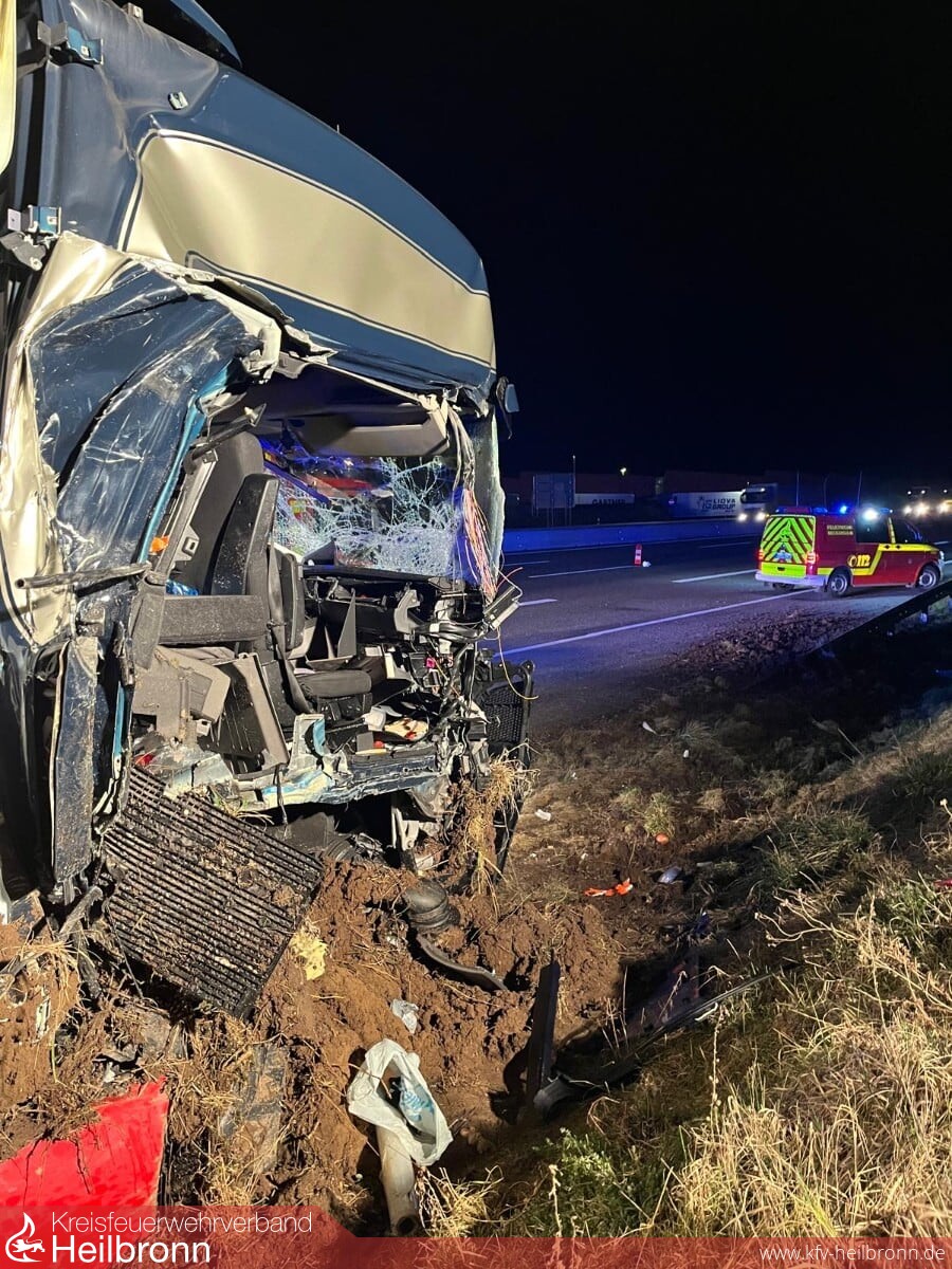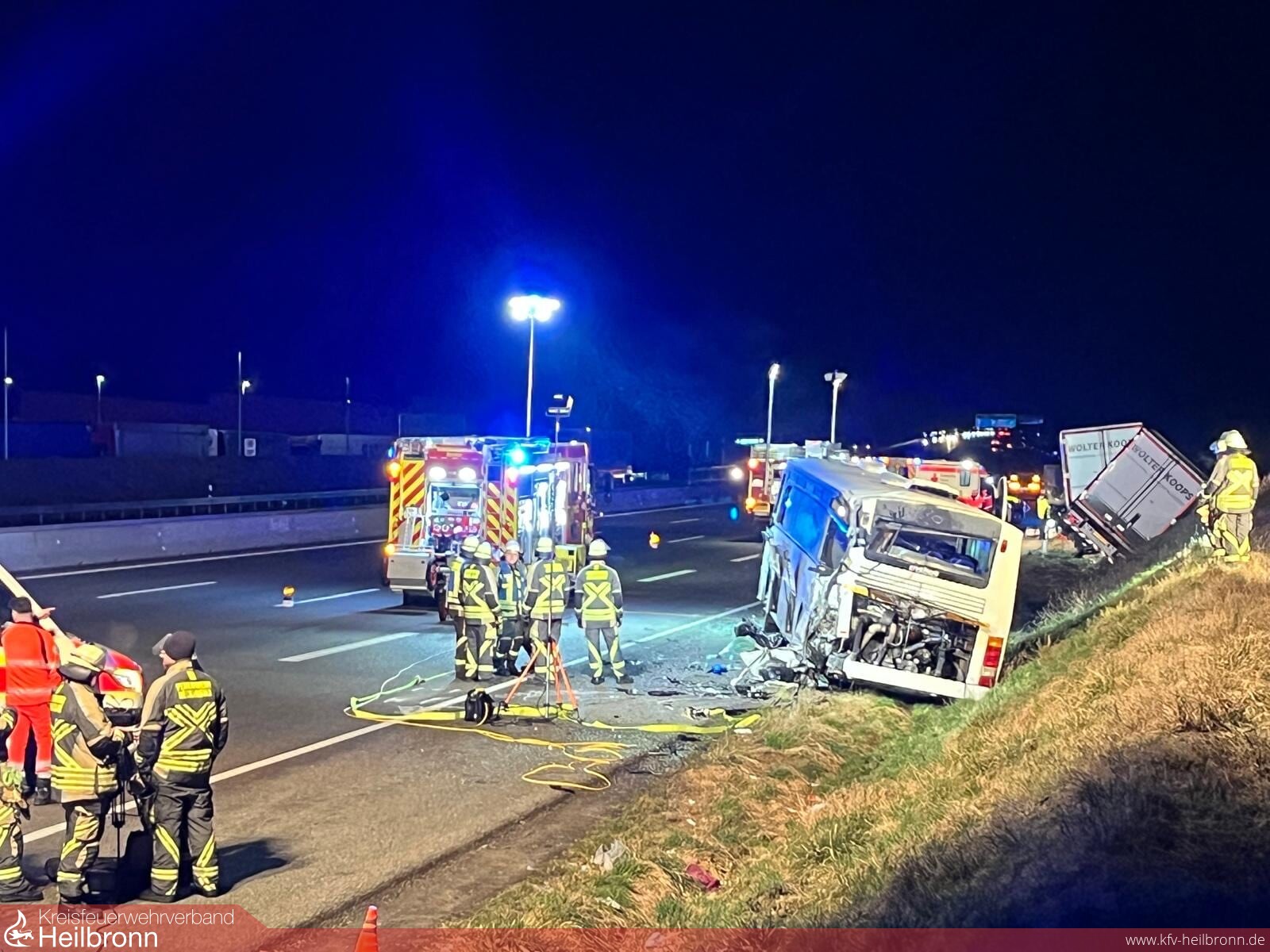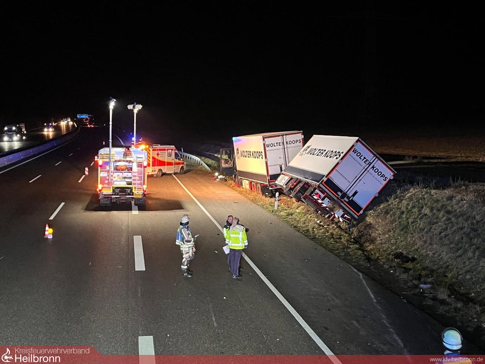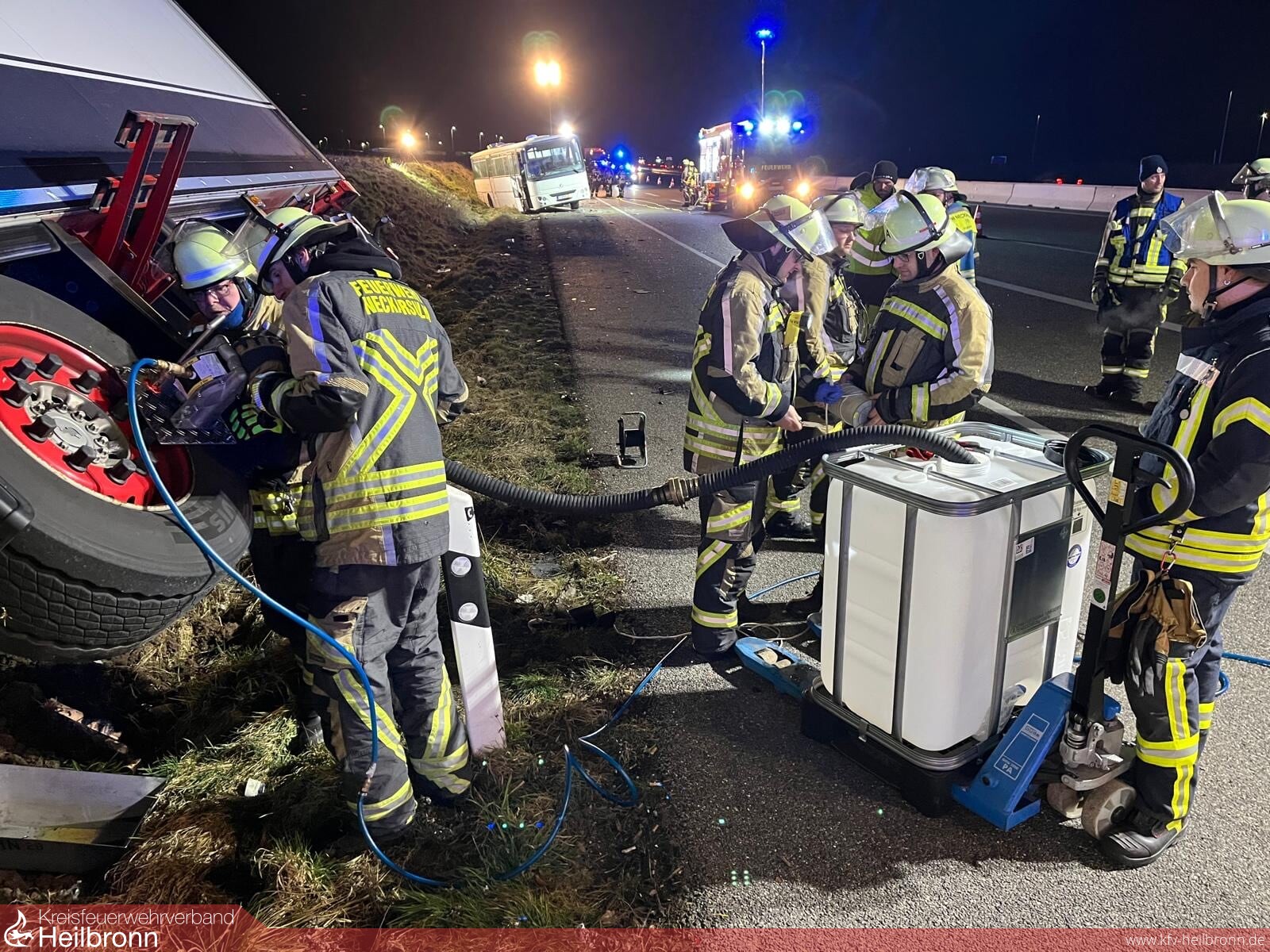 Die Feuerwehr sicherte die Unfallstelle ab, leuchtete die ca. 70 Meter lange Einsatzstelle aus, stellte den Brandschutz sicher, trennte die Batterien und pumpte Kraftstoff aus einem leckgeschlagenen Tank ab.