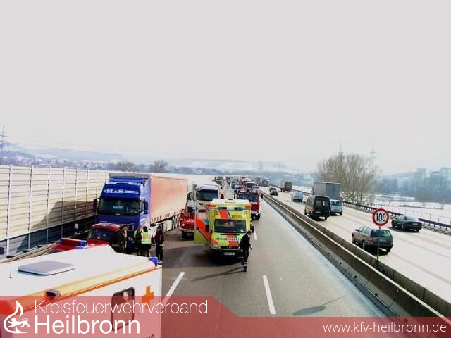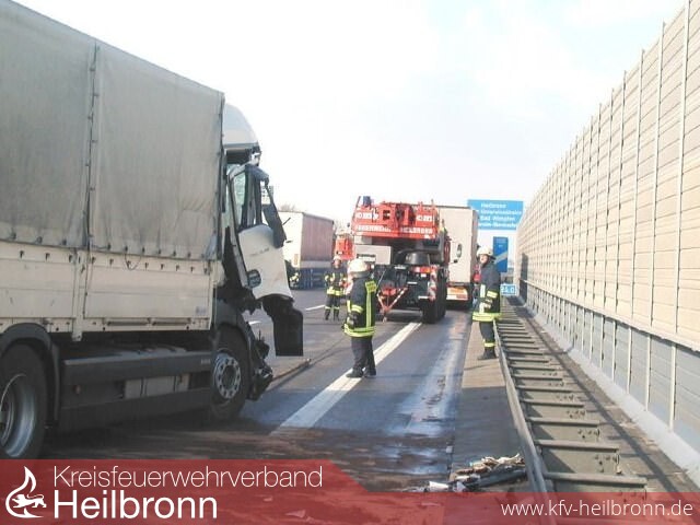 Am Dienstagmorgen kam es auf der Bundesautobahn 6, zwischen der Anschlussstelle Neckarsulm und Heilbronn/ Obereisesheim zu einem Auffahrunfall zwischen zwei Lastkraftwagen. Der Fahrer eines mit verschiedenen Gefahrgütern beladenen Gliederzuges erkannte das Stauende zu spät und fuhr auf einen stehenden Sattelzug auf. Hierbei wurde der Beifahrer im Führerhaus eingeklemmt. Die brisante Ladung blieb bei dem Aufprall glücklicherweise unversehrt.