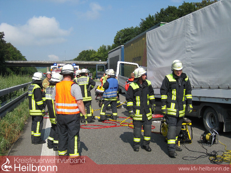 waren mit zahlreichen Einsatzkräften vor Ort und befreiten den Verletzten aus dem Wrack. Anschließend wurde der LKW-Fahrer mit einem Rettungswagen ins Krankenhaus gebracht. Weitere Personen wurden nicht verletzt. Für die Dauer der Unfallaufnahme sowie der Bergungsarbeiten musste die Richtungsfahrbahn zeitweise gesperrt werden. Es bildete sich ein Rückstau von etwa fünf Kilometern Länge. Die Fahrbahn war gegen 11.30 Uhr wieder vollständig geräumt.