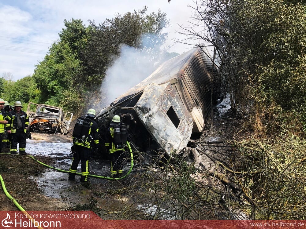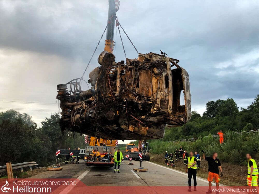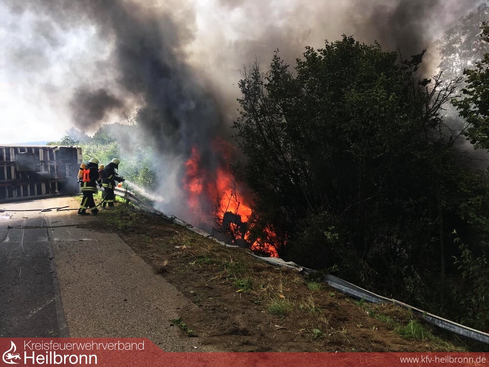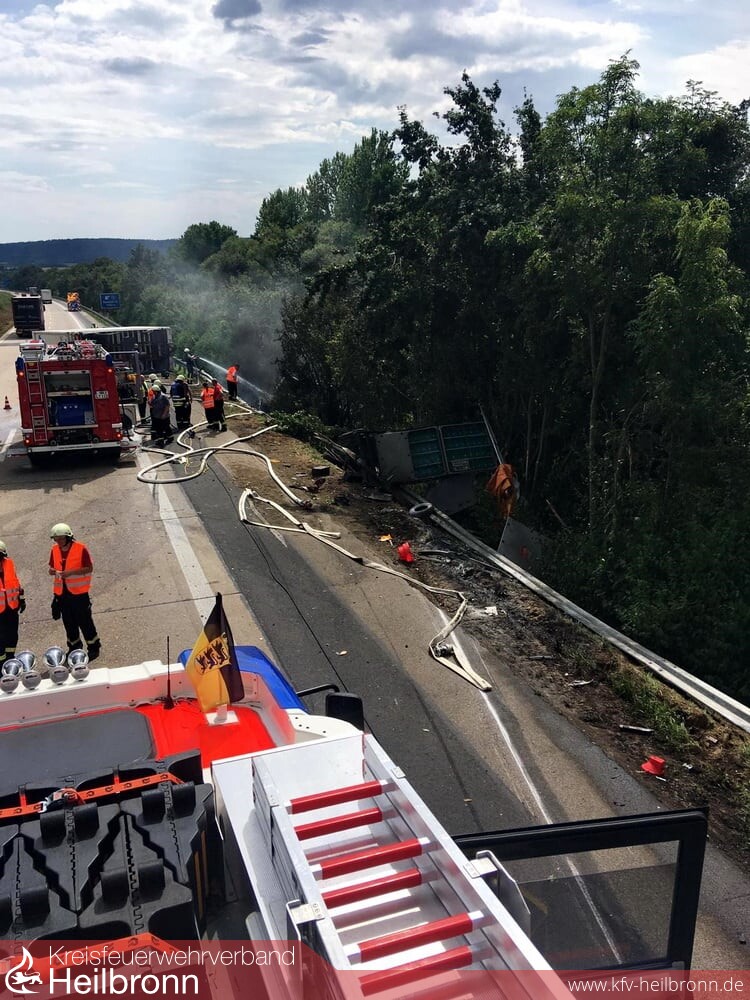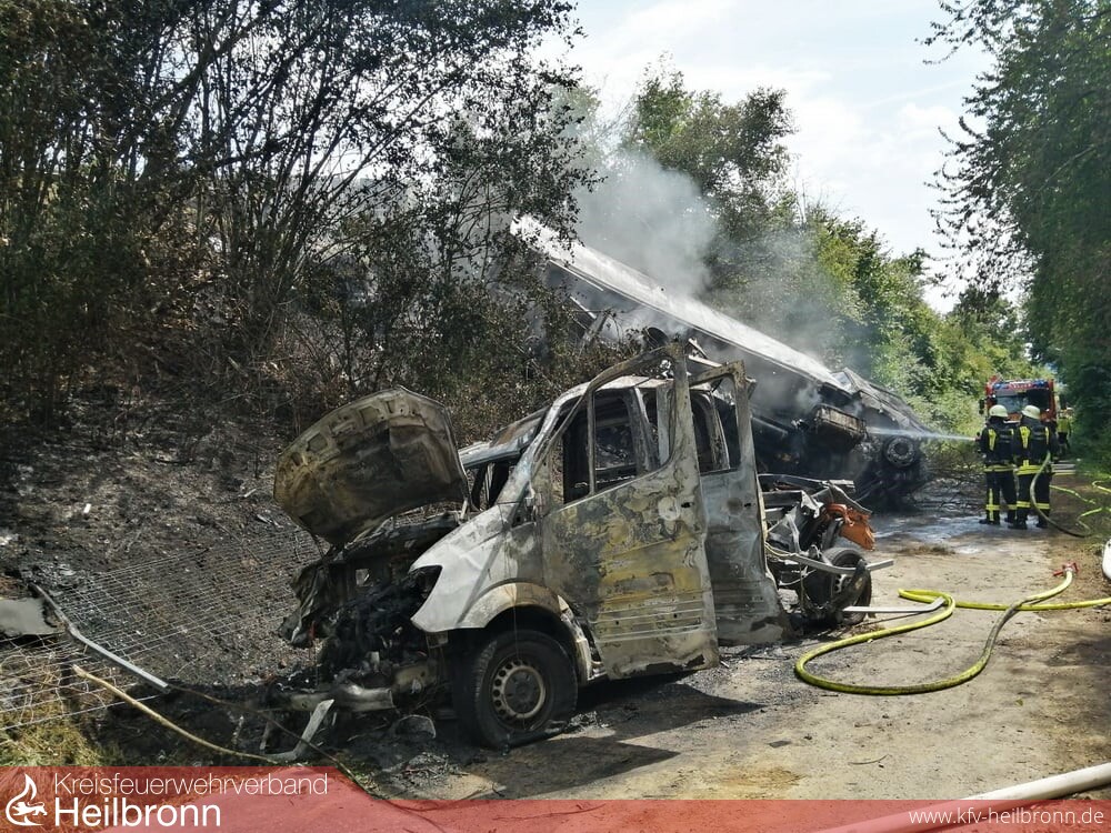Die Feuerwehr Neuenstadt fuhr über einen parallel verlaufenden Wirtschaftsweg an und löschte den Sprinter der Autobahnmeisterei ab. Da das Gehölz der dortigen Böschung ebenfalls in Brand geraten war, wurde die Feuerwehr Neckarsulm mit einem Löschfahrzeug sowie dem Abrollbehälter Wasser alarmiert.Die Feuerwehr Möckmühl löschte den in der Böschung liegenden LKW ab.