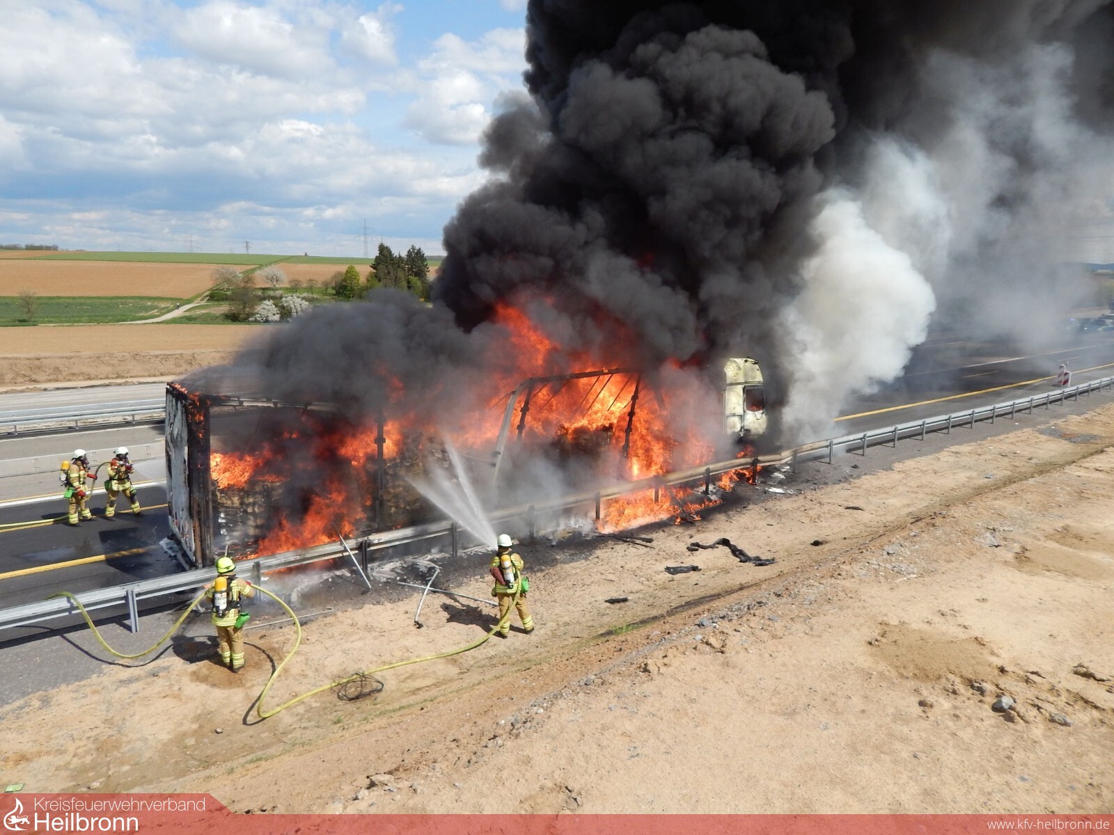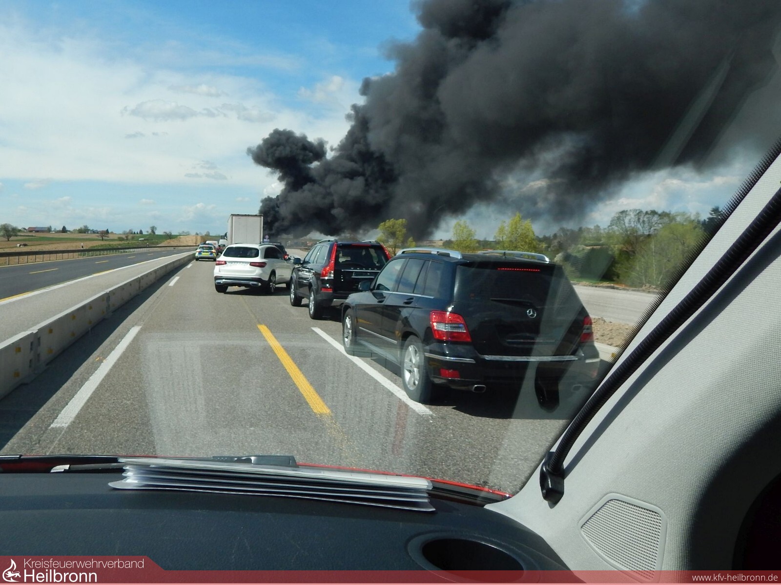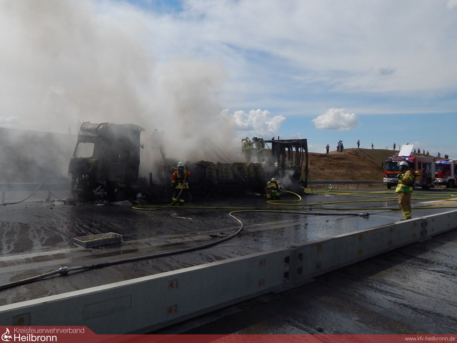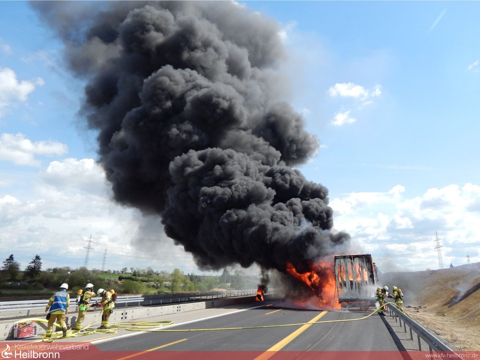 Auf der Bundesautobahn A 6 zwischen den Anschlussstellen Bad Rappenau und Heilbronn-Untereisesheim kam es am frühen Nachmittag zu einem Vollbrand eines mit Kunststoffgranulat beladenen Sattelzugs.